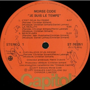 For this album , their record company allowed to send Morse Code to Britain to record it and one can hear the difference , not in the production , but in the writing . The singing is still in french but the the music veers of to Fruup , BJH, ATTOT Genesis . Another change is that there are no major lengthy composition like the full-blown Procreation or La Marche des Hommes. The longest (and worthiest) track is the title-track, which clocks in around 7:30 but it does have a smaller number linked to it. The rest of the songs glide on smoothly and are of the usual MC caliber/standard. Un-fortunately, one cannot help to think that the opening track was premonitory as this was to be their last album, as Capitol was to find that their expectation (sales-wise) might be too ambitious and the Disco Wave was to strike Québec like a tsunami.