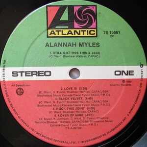 The ‘Alannah Myles’ first self titled album released in Canada in the spring of 1989 produced four Top 40 hits, “Love Is”, “Black Velvet”, “Lover of Mine”, and “Still Got This Thing”. Released internationally in 1990, Atlantic records finally hit pay dirt with her number one international smash, “Black Velvet”, winning a Grammy award for best female rock performance, along with several Canadian Juno Awards, a Diamond award for sales in excess of one million in Canada – the only artist who still retains this status for a debut record. After it’s first year of release Black Velvet received the ASCAP award for over one million radio plays and the ASCAP ‘Millionaire Award’ in 2005 for over 5 million radio plays. SOCAN in Canada awarded the songs, “Black Velvet” and “Lover Of Mine” each with an award for over 100,000 plays in Canada in 2005 with her #1 hit ‘Song Instead Of A Kiss” to follow.