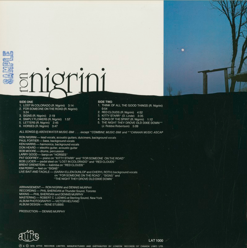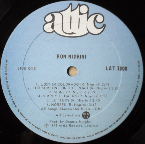 Canadian singer/songwriter Ron Nigrini released his self-titled studio album in 1974. He pursued a solo career following time in The Coachmen and Dan's Heard, signing with Attic Records. For fans of The Mamas and The Papas, Harry Chapin, Jim Croce, and The Band (whom Nigrini covers on this album's final track).