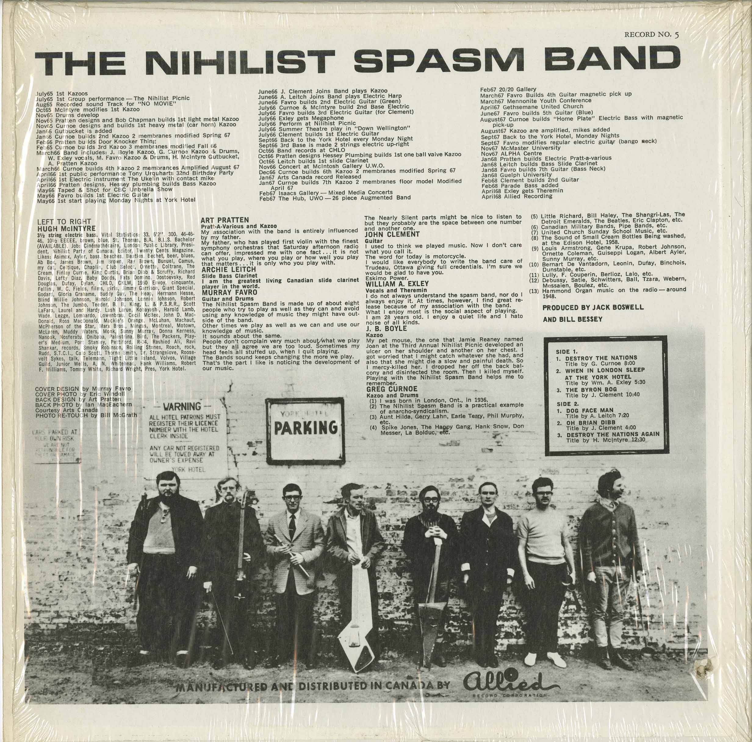 Greg Curnoe (artist) kazoo and drums (deceased), Hugh McIntyre (curmudgeon/polymath) bass (deceased) and Archie Leitch (permanently retired) play less often.