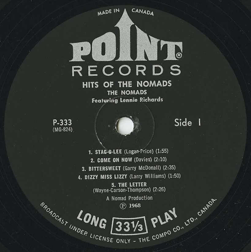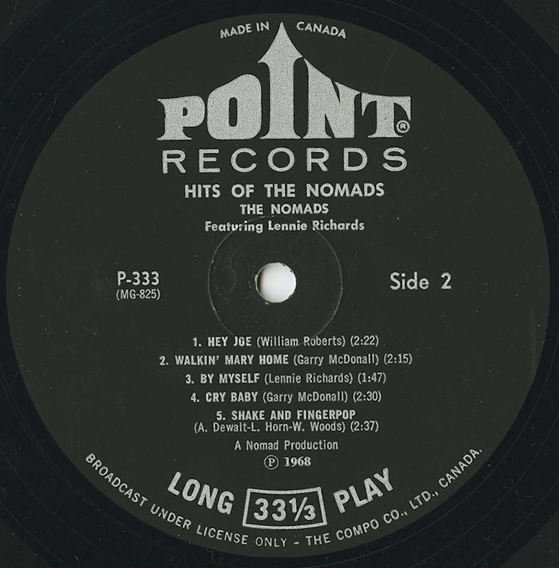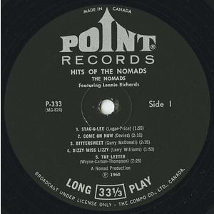 The Canadian version of the band with the name "Nomads" were from Edmonton, Alberta. They were a rock and roll band who formed around 1964 and had some regional success. They released this, their only LP, in 1968 on Point Records P-333, a Damon Records Production. The album followed four 45's, which were all released in 1967: Cry Baby b/w By Myself on Damon Records D-001; Dizzy Miss Lizzy b/w Walkin' Mary Home on Damon Records D-002; Bittersweet b/w Come On Now on Damon Records D-003; Hey Joe b/w The Letter on Damon Records D-004.