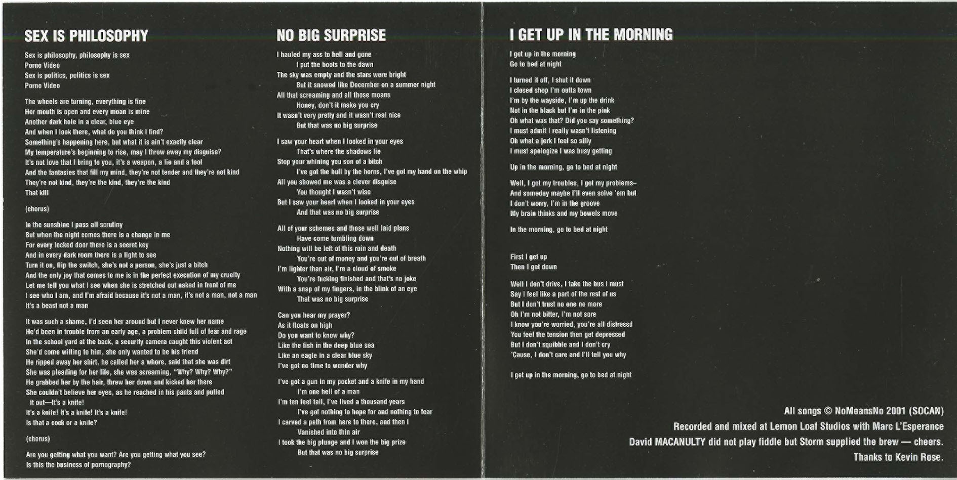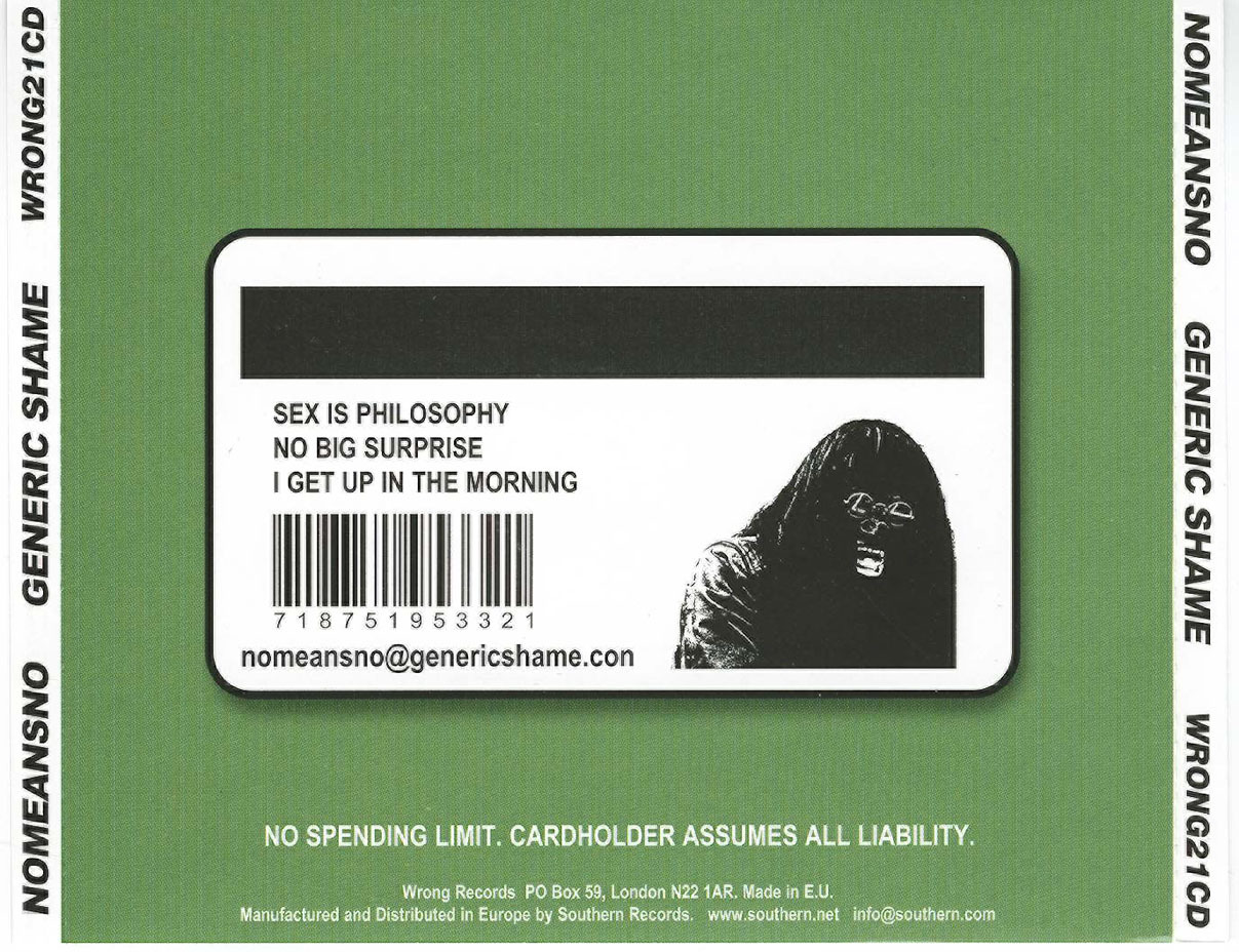 Generic Shame is a rather lengthy three song EP described as “generic” by the band themselves. However, that is quite far from the truth based on listening to this EP nonstop since getting it from overseas. Recorded during the same sessions as their 2000 release, One, Generic Shame exceedingly proves that the last recording session for the band has by far become their most fruitful session to date. The sound quality of Generic Shame is phenomenal, the production giving the songs a very clear and thunderously heavy charge to them. The first two songs are long, drawn out epics as Nomeansno has been prone to write for the last few years. “Sex is Philosophy” is a basic, Rob Wright observation on pornography’s less glamorous social effects. The centerpiece of the EP is “No Big Surprise”, which is a very lengthy eleven minutes plus. This song can best be described as progessive punk blues and might remind some listeners a bit of “This Wound Will Never Heal” from One Down and Two to Go. Wright’s vocals are top notch here, giving his voice an incredibly powerful emotional charge that he hasn’t attained often. The final track is a ska-punk type number done in typical Nomeansno style. “I Get Up in the Morning” is the most energetic, fun number the band has written since perhaps “Everyday I Start to Ooze” from O+2=1. It’s interesting to hear what a band such as Nomeansno can do with a rather tired, worn out trendy sound.