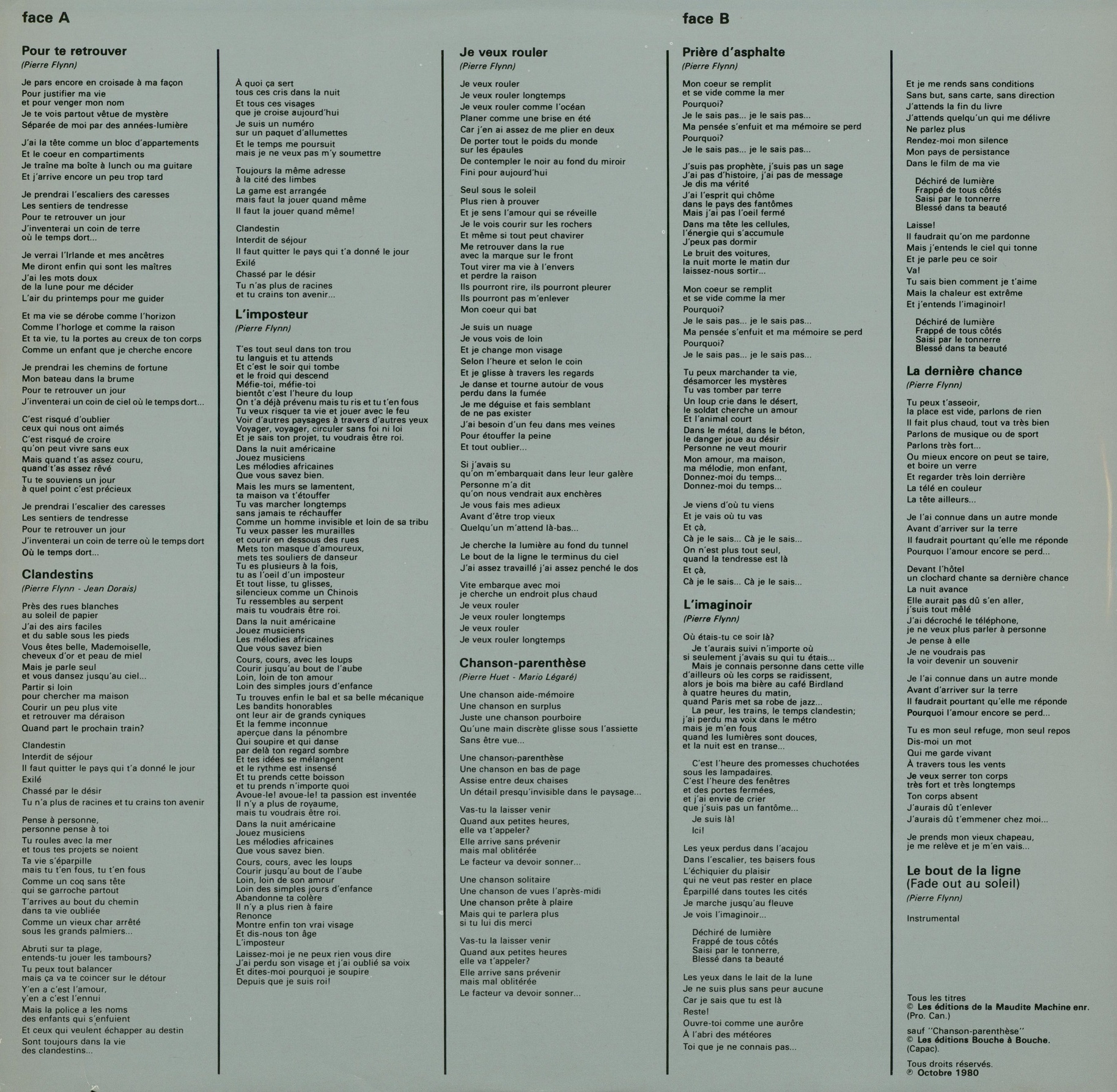 All songs written by Pierre Flynn