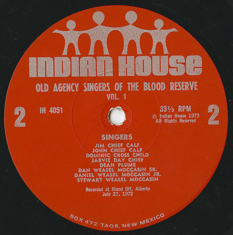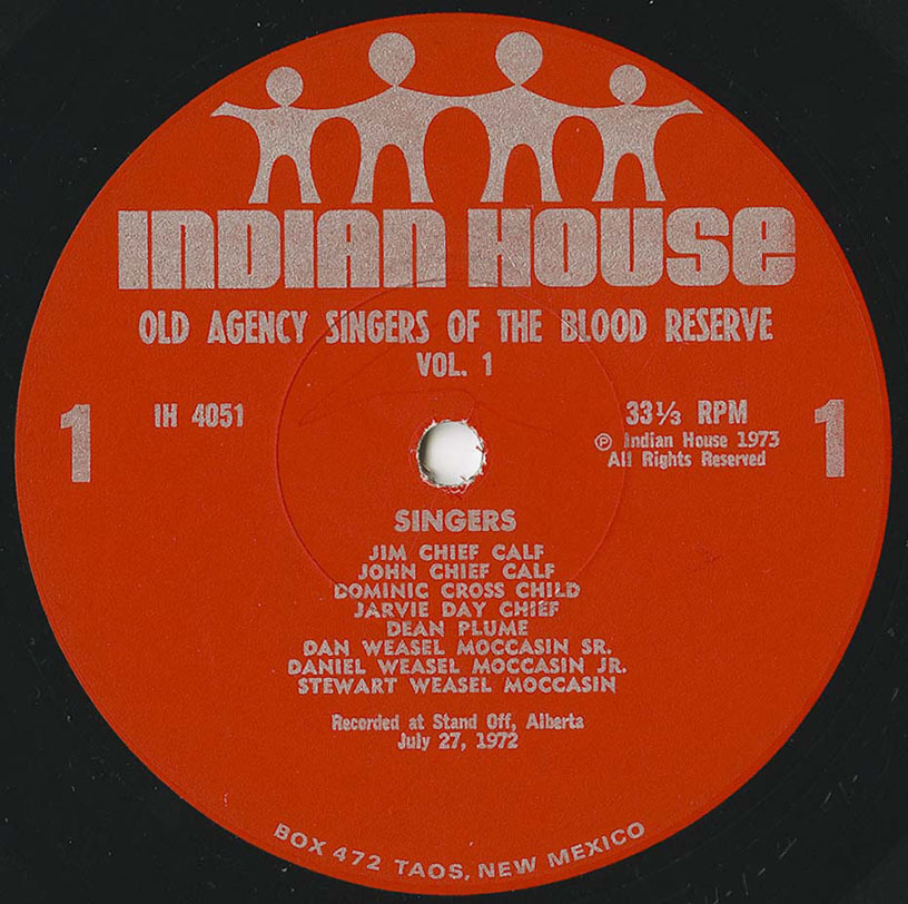 liner notes: "The Old Agency Singers have been singing as a group for the past 25 years. Although most of the members have changed over the years, a few of the original members are still in this group. They are called the Old Agency Singers because most of them live in the area of the old Blood Agency.