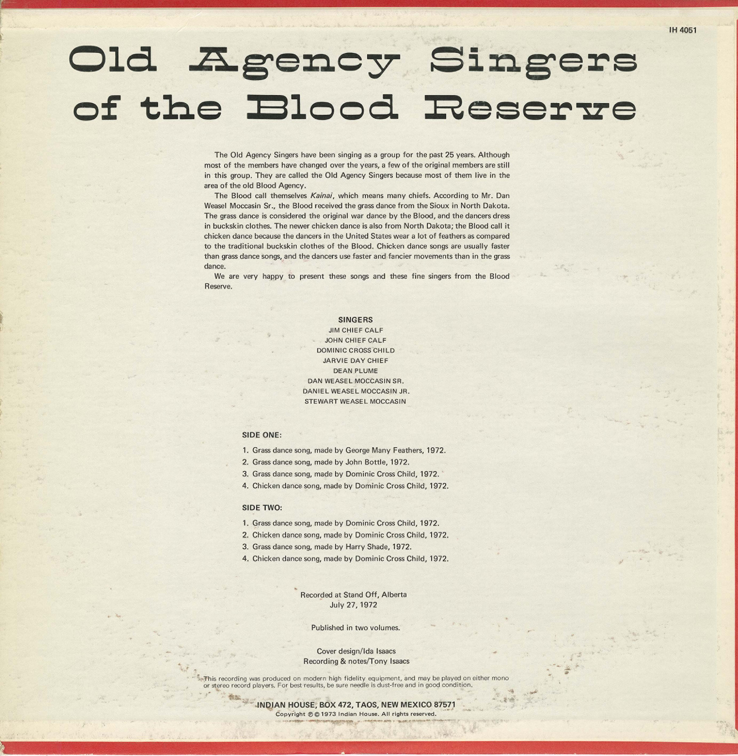 The album was recorded at Stand Off, Alberta on July 27, 1972. It was published in Two Volumes. Featured here is the First Volume. The cover design was by Ida Isaacs. The recording & notes were by Tony Isaacs. The album was produced by Indian House IH 4051, Box 472, Taos, New Mexico 87571, USA.