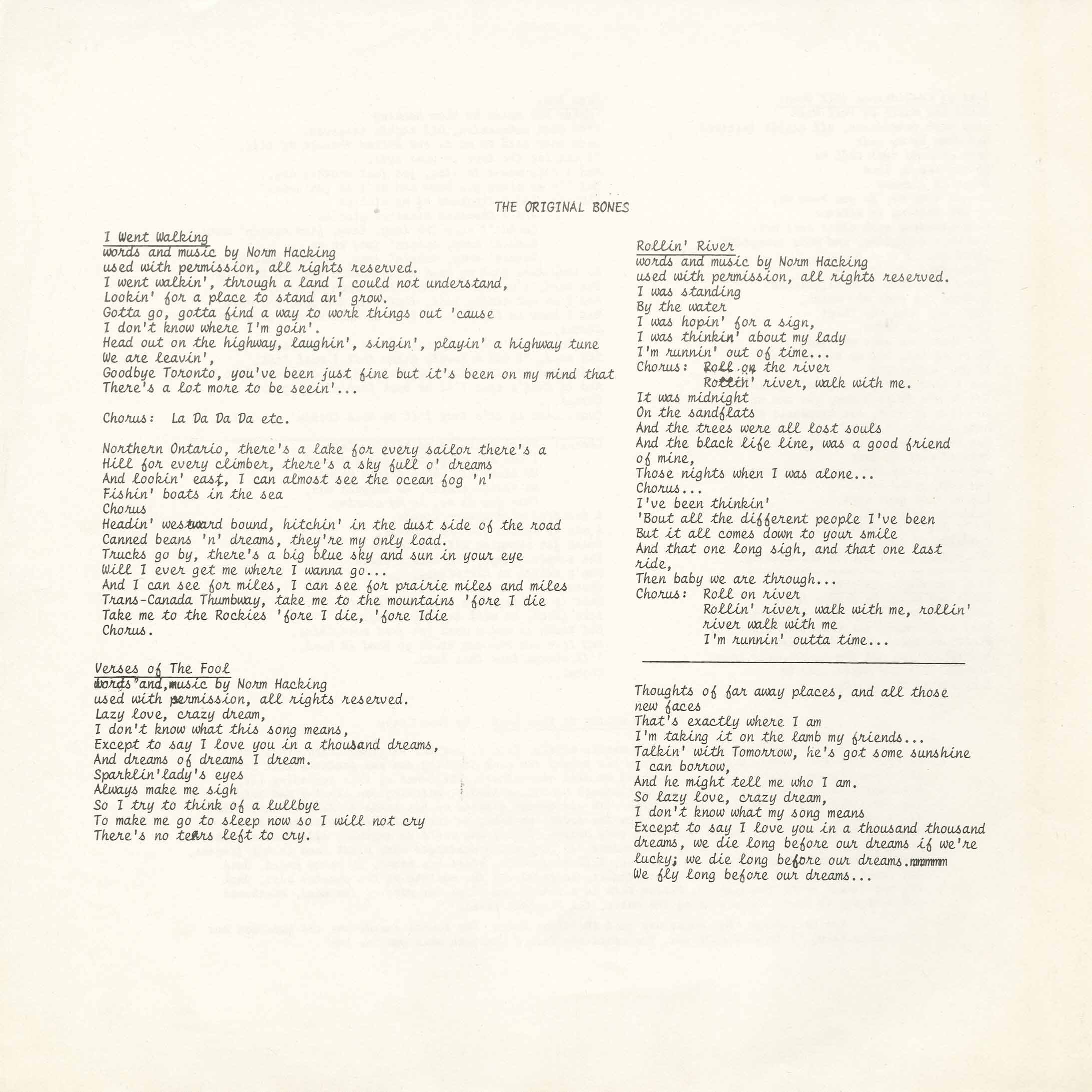 Musically, Original Bones moves through shades of folk, blues, and balladry with ease. There's an unpolished beauty in its raw, live-off-the-floor recordings—one mic, minimal overdubs, and voices blending with tape hiss and room tone. Norm Hacking’s contributions shine early: songs like “I Went Walkin’” (“Take me to the Rockies before I die...”) capture his natural lyricism and the tenderness that would define his later work. There’s something haunting about hearing that line now, knowing Norm passed away in 2007 at the age of 57. He did, in fact, make it to the Rockies.