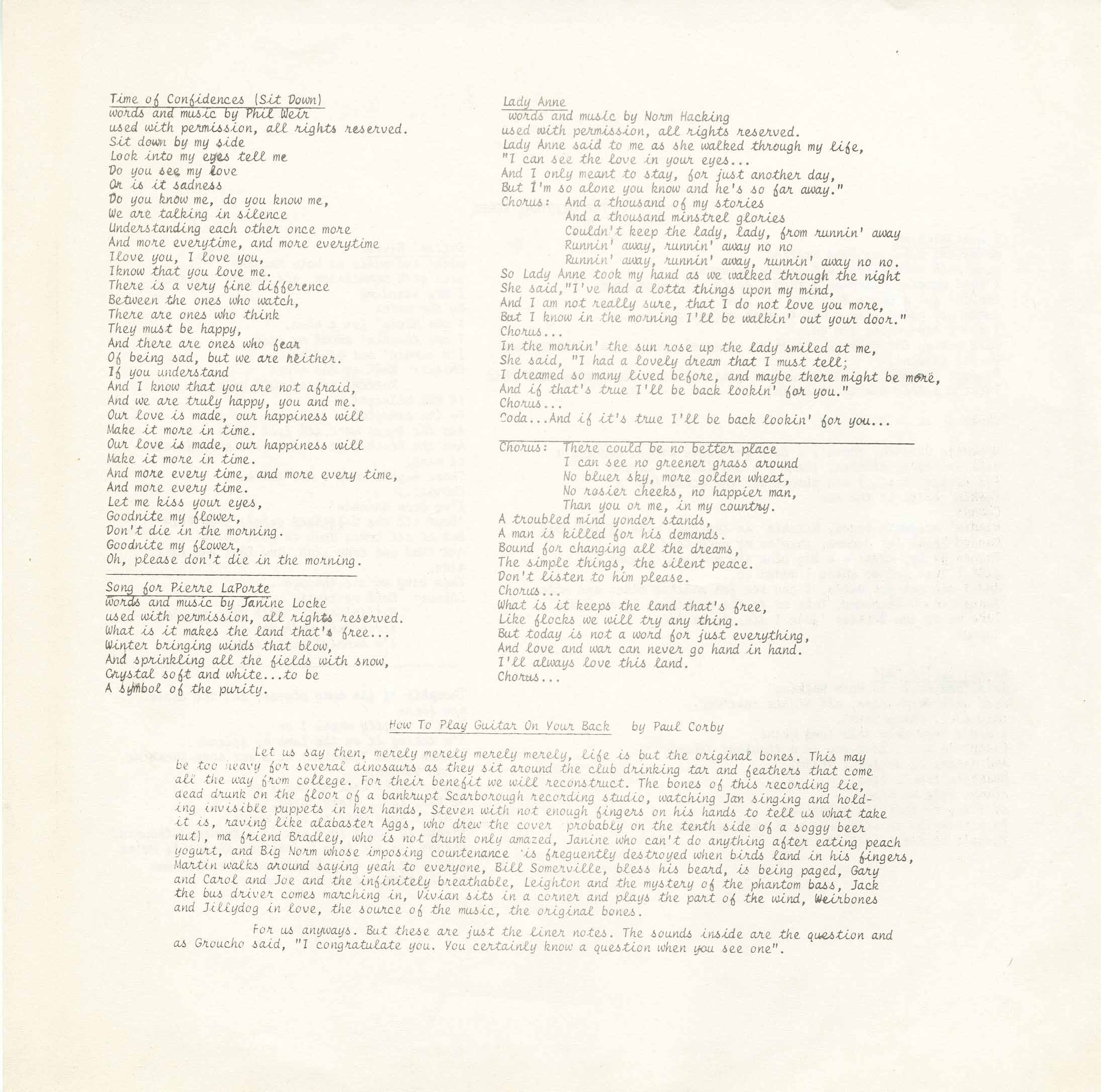 Only about 50 copies of Original Bones were ever pressed. Each was packaged in a hand-pasted cover with an illustration of a skeleton bowing—drawn by Don Agro—echoing the spirit of a project that felt more like a creative gathering than a formal album. Those who dropped by the sessions were students, local musicians, and friends of friends, contributing vocals, guitars, harmonicas, and heart. Among them were Paul Corby, Jan Duncan, Vivian East, Greg and Martin Farrell, Gary Lipton, Janine Locke, Jackie McCormick, Jack Pickles, and others with nicknames as memorable as their performances. At its core, the record is a love letter to community, creativity, and the improvisational magic that arises when no one’s watching.