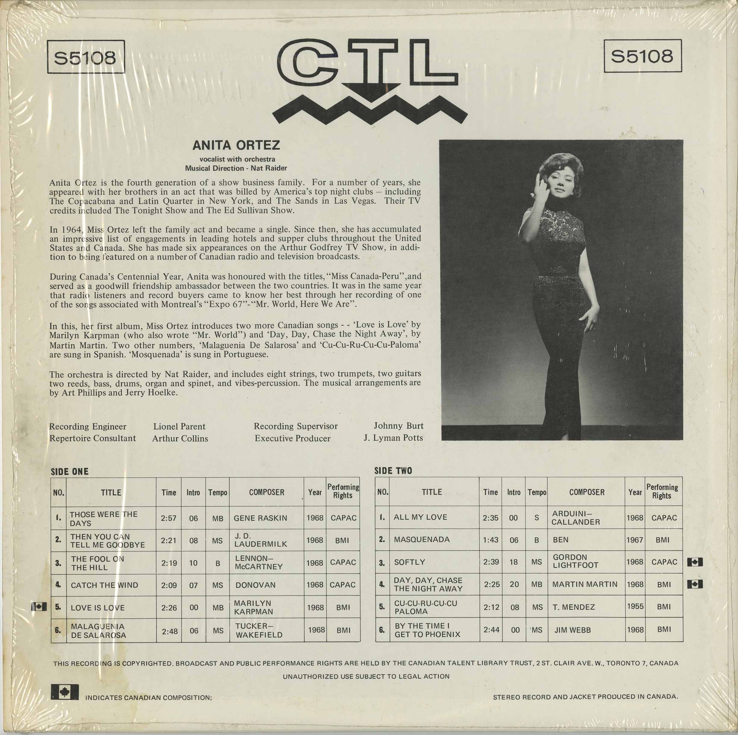 This, Anita's first album features two Canadian originals, "Love is Love", by Marilyn Karpman (who also wrote "Mr. World") and "Day, Day, Chase The Night Away, by Martin Martin. Anita was Miss Canada-Peru for Canada's Centennial in 1967.