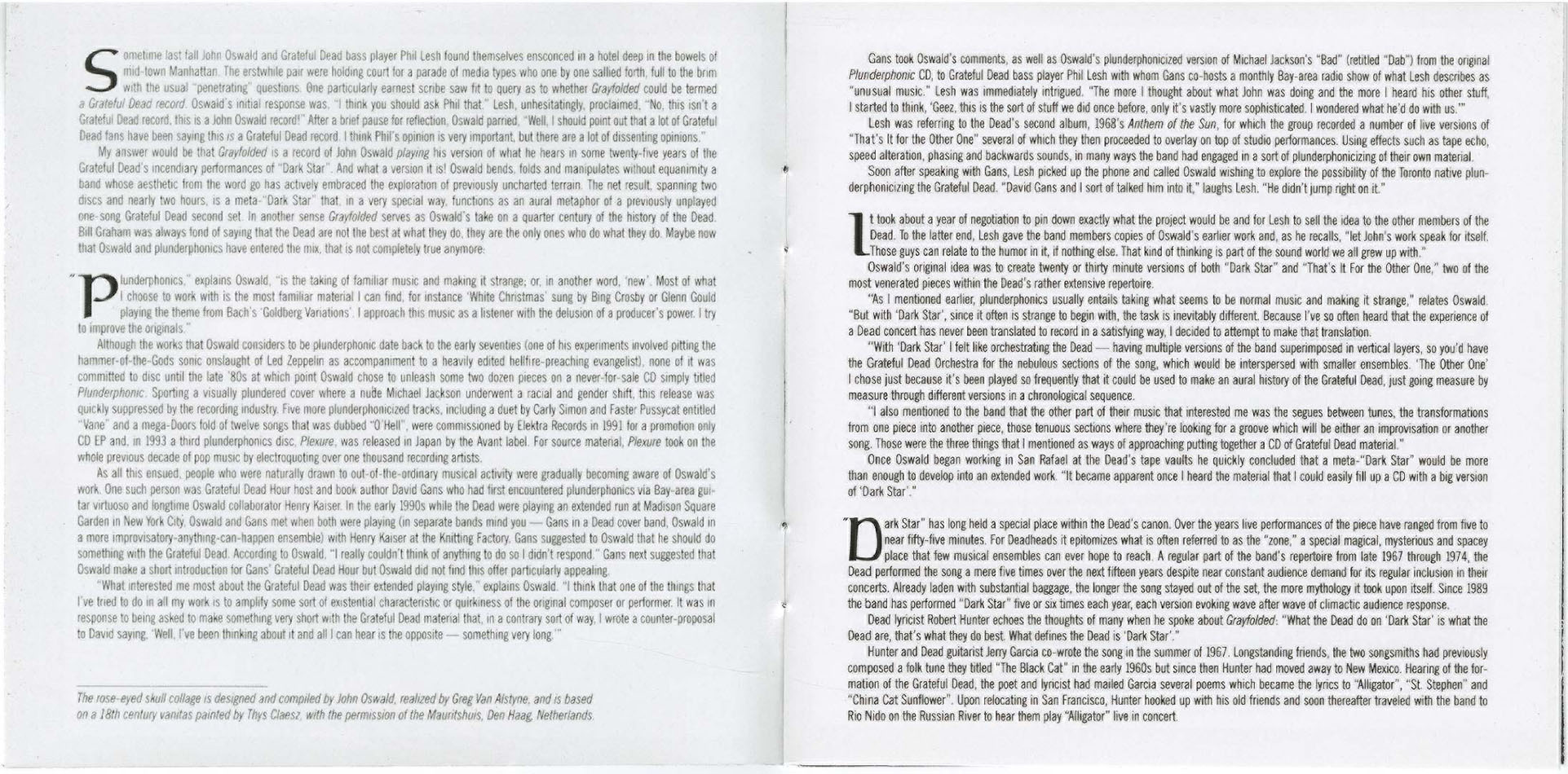 (August 11, 2004 / TORONTO) John Oswald's FONY label has decided to reissue the critically and popularly acclaimed 2CD Grateful Dead plunderphonic GRAYFOLDED. Out of print since June 2000, the 2004 edition (10th year anniversary) features exclusive background info and interviews with Jerry Garcia, Phil Lesh, and Robert Hunter plus 2 "time maps" which chart the source Dark Stars used and a 10,000 word essay by musicologist Rob Bowman. Gary Lambert, editor of the Grateful Dead Almanac said : "The decade-leaping GRAYFOLDED is an astonishingly accurate evocation of that sublime, hallucinatory 'unstuck in time' feeling one gets at a really good Grateful Dead show."