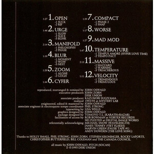 John Oswald's piece de resistance. Twenty minutes of some of the most insane editing, cross-fading, beat matching, cultural name dropping and sampling. No other work even comes close to the intensity of Plexure. John Oswald proves he is a virtuoso of Pro Tools, over a thousand different artists edited, spliced and mixed together. Many of the sampled pieces are just long enough to be recognizable and yet short enough that by the time you can consciously identify the track your ears have been pummeled by another 15, and all matched up as seamlessly as humanly possible. One of the most beautiful and simultaneously insane and aggravating experiences in audio ever produced. A must listen and a must have.