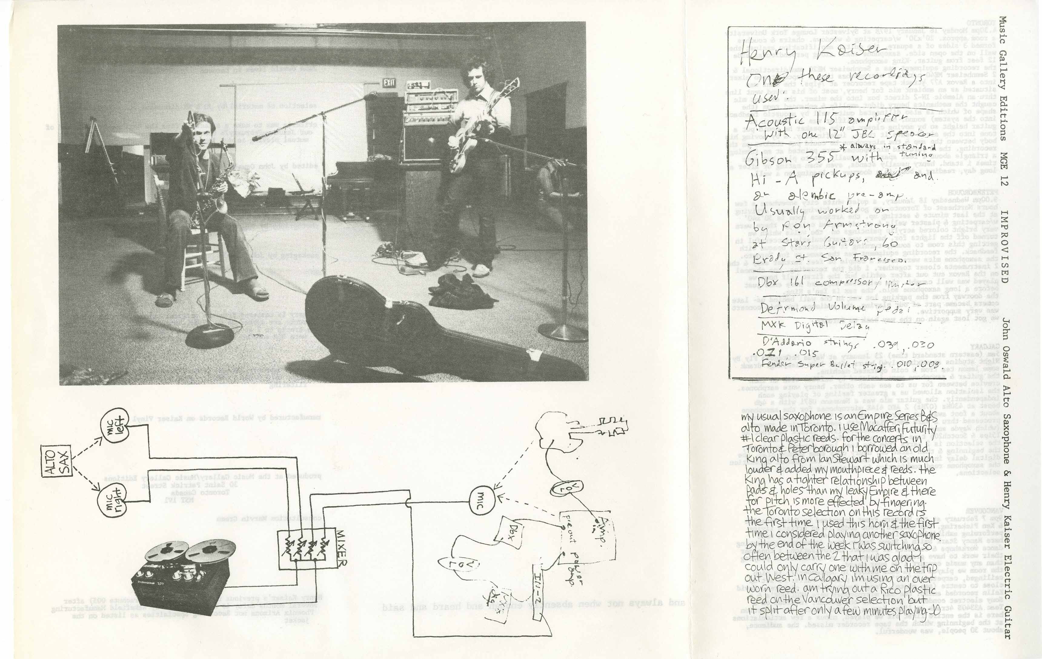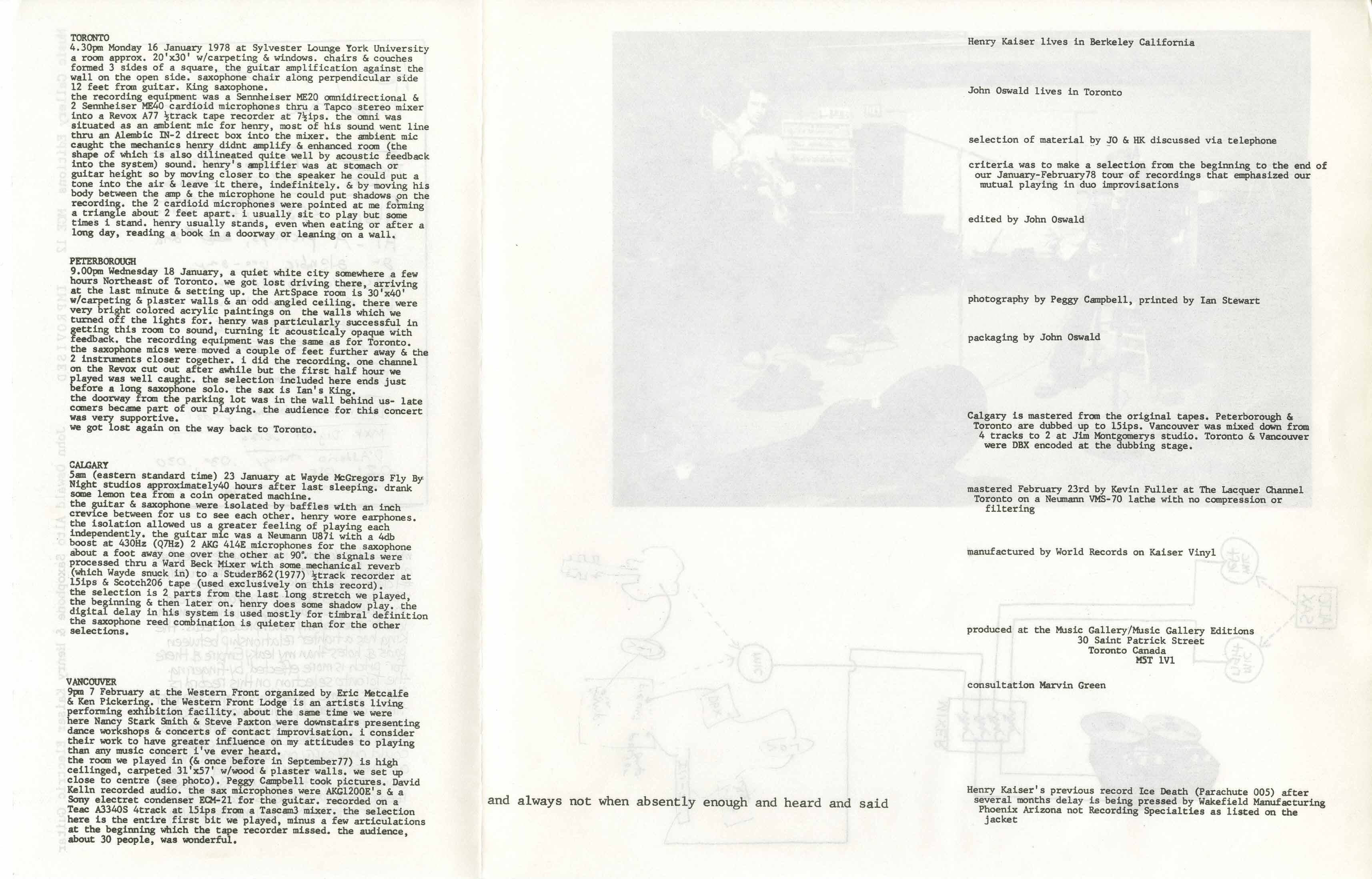 While both men on this recording have gone on to bigger things, it would be difficult to claim they did anything better than the two concerts documented here from 1978 and recorded at the Western Front in Vancouver. The John Oswald on this disc is the saxophonist, not the plunderphonics genius (yes, they are the same man but there were no plunderphonics in 1978). These dates, so difficult to tell apart because of their exacting material set ups, are revelatory in the way that they tell the real story of an event — or series of them — where two men walk in off the street, get their gear together, and go about making music of such uncommon quality and range, with little if any forethought of what it might sound like. The notions of attack, dynamic, harmonics, and timbral invention were all created on the spot in a unique language that exists only between these two improvisers; for the doubting Thomases, give a listen to any work by either man and you'll hear the evidence for yourself. The linguistic considerations ought to bear by such a collaboration are no doubt the result of much hard work and intent listening, but the execution appears effortless and full of humor and grace. From ribbons of sound note skeins on soprano, tenor, and alto saxophones to bent string tremolo techniques whispering and then shouting their assent, these proceedings stray from the path of competition toward the shared terrain of collaboration and mutual imaginational intrigue. There are no seams between concerts or years, and no lapses in judgment or quality — let alone invention — in this music. Just turn it up all the way and let it wash all over you. Amazing.