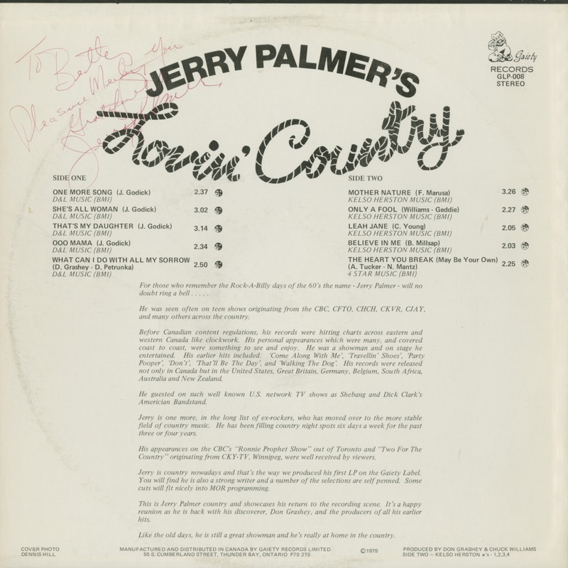Before Canadian content regulations, his records were hitting charts across eastern and western Canada like clockwork. His personal appearances which were many, covered every province, city and town. With a western sound and his charm, Jerry Palmer won over the country crowds. He was often compared to such artists as Conway Twitty and Johnny Horton. Records such as “Travellin’ Shoes”, “Making Love”, “Shadow Of Love”, “Sweet Loretta”, “Don’t That’ll Be The Day”, and “Walking The Dog”, received heavy airplay, not only in Canada, but in the United States, Great Britain, Germany, Belgium, South Africa, Australia and New Zealand.