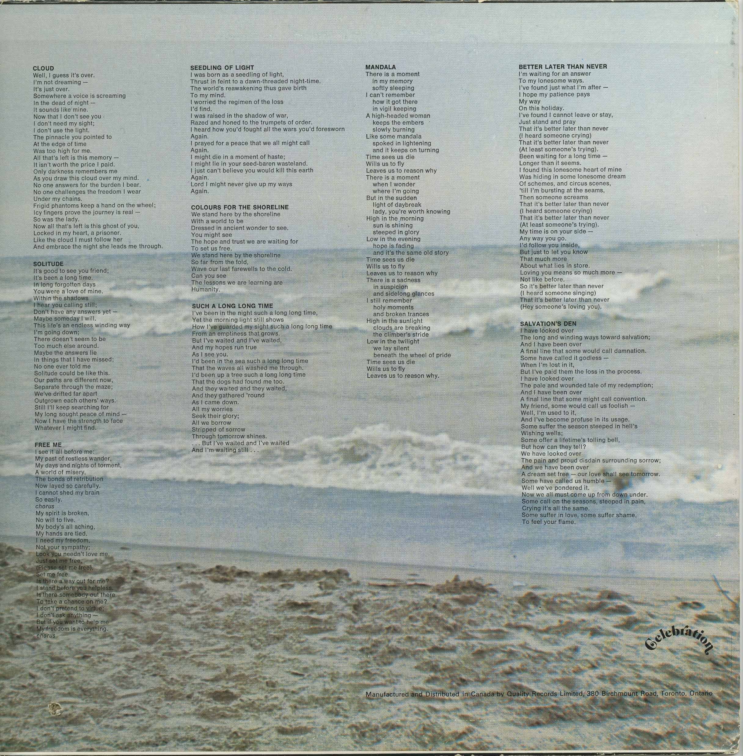 We Shall Come Together – This does not appear on the original album, just on the reissue, and it’s actually “Hey, Old Timer”. I cut it from the album because I couldn’t figure out where it fit in the song cycle. “We Shall Come Together” was on my demo, and looking back, I should have put it on Shorelines – it was the closest thing I had to a single.