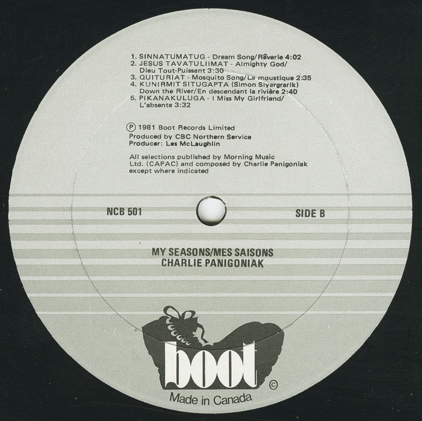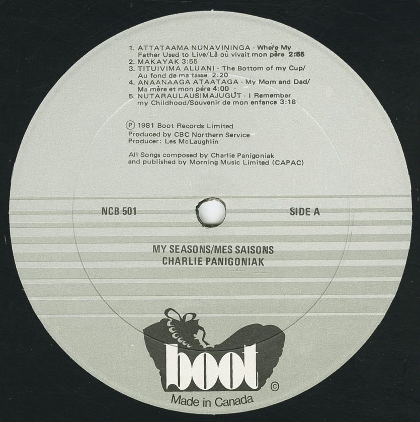 Panigoniak’s wider recording career began in 1973 when CBC producer Doug Ward heard him perform and arranged recording sessions in Toronto for the CBC Northern Service. Over the following decade, Panigoniak recorded a series of influential releases for CBC, including two EPs and several full-length albums. Among the most significant were Inuktitut Christmas & Gospel Songs, My Seasons (later issued commercially by Boot Records), and Just for Kids. These recordings not only preserved his work but also became essential listening throughout Inuit communities, broadcast regularly on northern radio and passed from household to household.