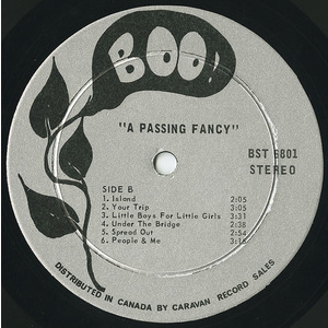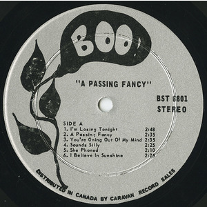 Originally known as The Dimensions, A Passing Fancy sprang up in Toronto's Yorkville Village in 1966. After a few shows in the Village, record store owner Walter Honsberger and partner Dan Bartollini began shaping the band's sound and image, eventually bringing them to the doorstep of Columbia Records, where they were signed to a standard six-sides contract (i.e. three singles).