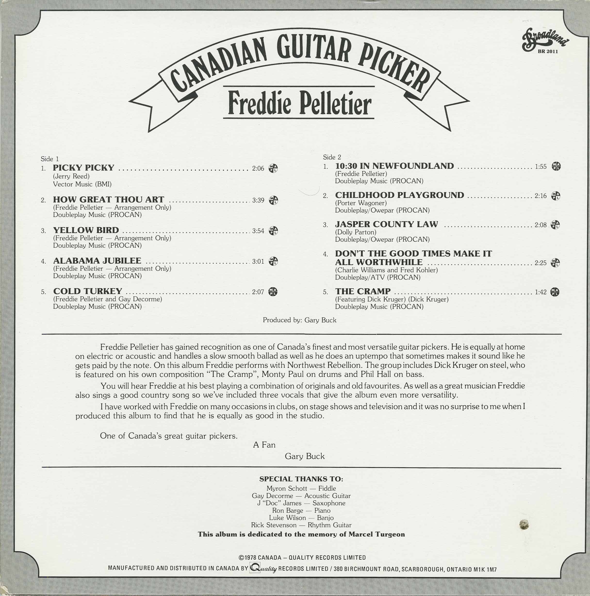 Fred Pelletier has gained recognition as one of Canada's finest and most versatile guitar pickers. He is equally at home on electric or acoustic and handles a slow smooth ballad as well as he does an uptempo that sometimes makes it sound like he gets paid by the note. On this album Freddie performs with Northwest Rebellion. The group includes Dick Kruger on steel, who is featured on his own composition "The Cramp", Monty Paul on drums and Phil Hall on bass.