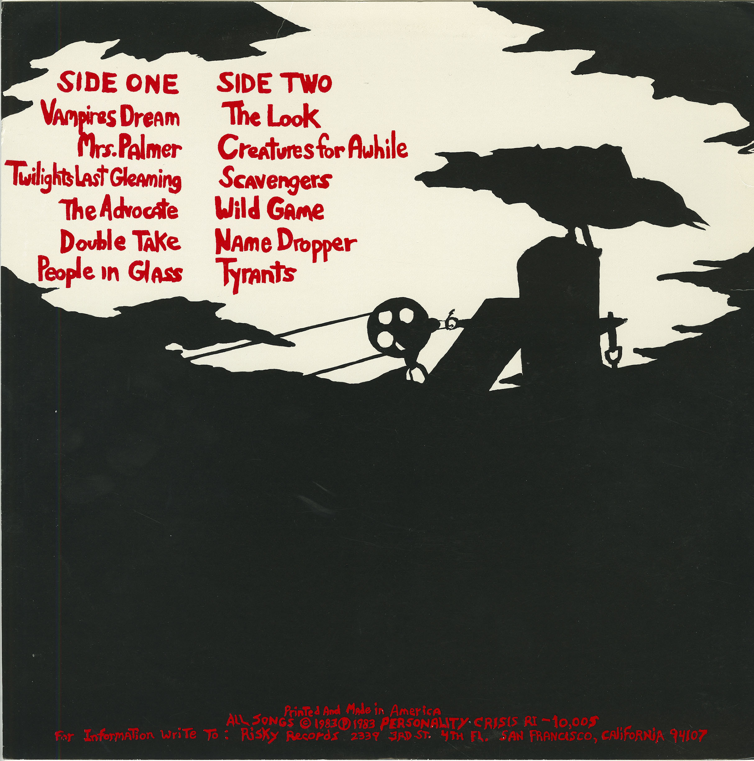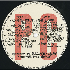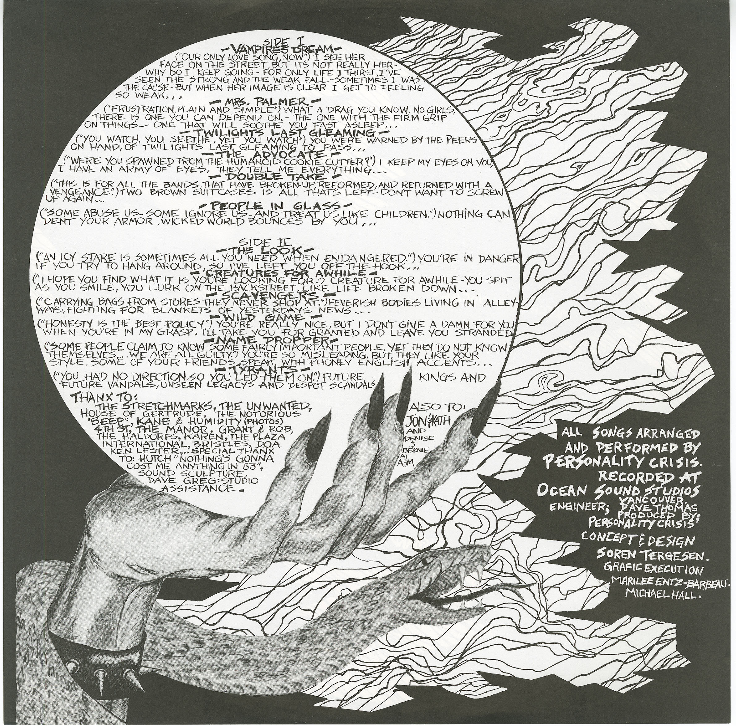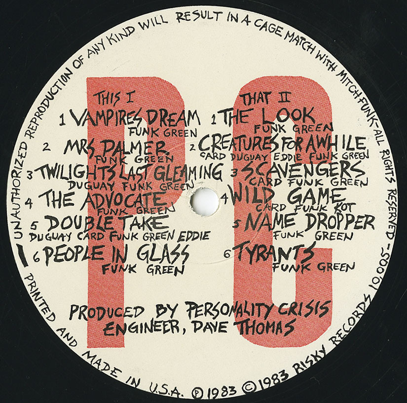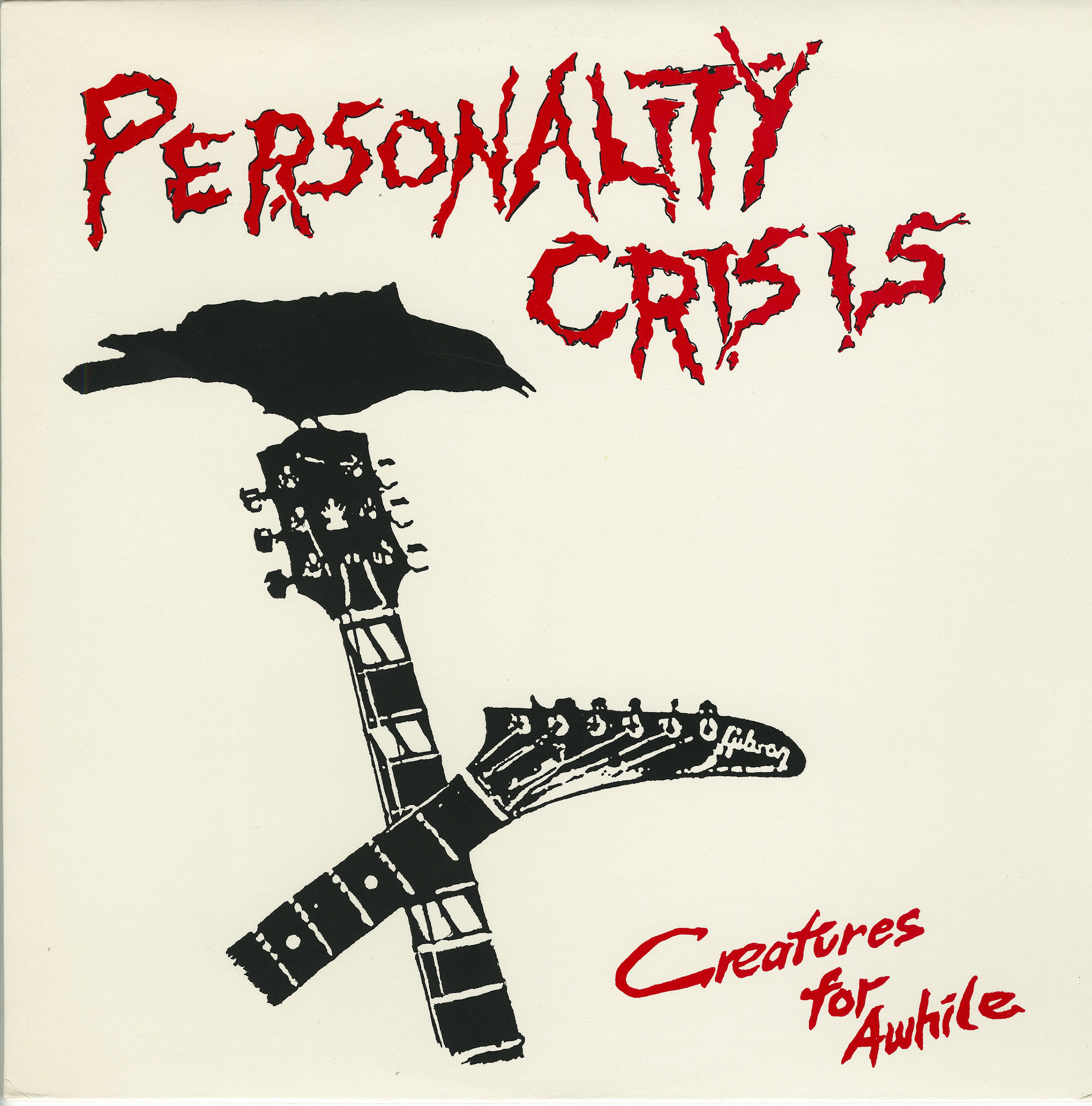 Mitch calls a guy who came to meet them when they played back in Calgary who said he played drums. Mitch told me he had his number written on a piece of paper and that he left it in his jeans and forgot about it, so it went through the wash. When he eventually found it and unfurled the compressed paper the only thing Mitch could read was the blurry phone number. He called the number. After talking to Mitch on the phone, Jon 'Metro' Card quits his job and moves to Winnipeg to join PC. This lineup plays for a while. Then Richard leaves, so they get Duane Eddie on bass. Walter Kot leaves, then Richard returns - this time on guitar. The last great lineup of Personality Crisis is Mitch Funk on Vocals, Jimmy Green on guitar, Richard Duguay on guitar, Jon Card on drums and Duane Eddie on bass. They recorded their speedy lone star epic album Creatures for Awhile (1983) in Vancouver. Hard touring, bad paying gigs and the usual early punk disorganization finally took its toll and PC slowly disintegrated after a few final shows as a four piece in '84.