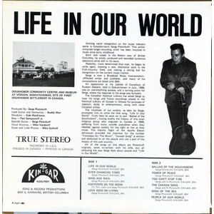 The injustices of our society, as seen by Serge, prompted him to write the title song, "Life In Our World". From here he went on to pen "'Ballad of the Doukhobors", tracing briefly the history of this small religious group who migrated to Canada in 1899, suffering from many outside prejudices when they rebelled against society for the right to live as they chose. The historic flight of the Apollo Eleven astronauts provided the incentive for the number "Footsteps On The Moon". "Canada Song" is written and dedicated to all the people who are a part of the mosaic of this vast country.