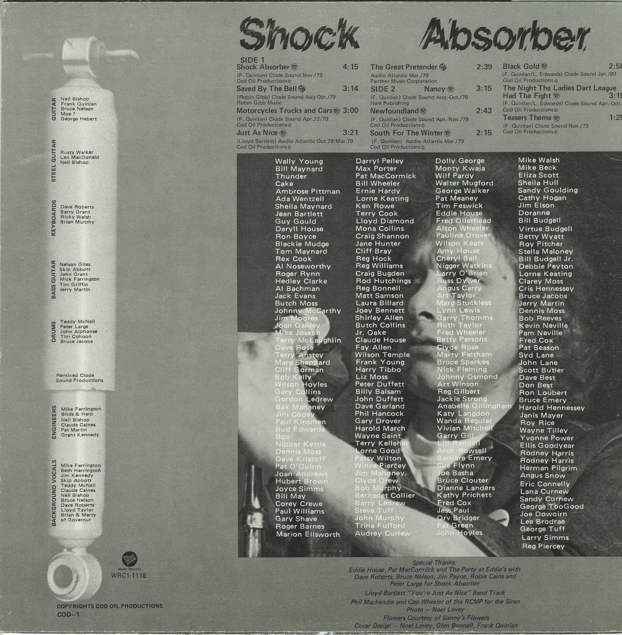 Peter Francis Quinlan released this terrific Newfoundland recording of folk rock synth with the help of THE who's who of Newfoundland recording artists of the day, not to mention the more than 200 other folks who likely contributed, as listed on the back of the album. Shock Absorber was released on what could be the-most-Newfoundland of Production companies - Cod Oil Productions. 8 of the 10 compositions were written by Peter Francis Quinlan. His best known song "The Night the Ladies Dart League Had the Fight", was a comedy ballad about The Bull's-Eyes and Debbies hucking darts at eachother down at Lucky's Place - the youtube video has more than 6,000 views. The song "Newfoundland" is the most psychedelic song ever written about the Rock. "Shock Absorber" is a Newfie synth rocker definitely worth the price of admission. Black Gold sounds as if it was written just the other day (except oil was at $12/bbl, gold went up from $160 to a whopping $200, and the Canadian dollar dropped from 94 cents to 86 cents against it's US$ counterpart). He returned in 1997 with his only other effort, Take Me Back to Newfoundland. Later on, he was co-executive producer for the "Singers For Fishermen" CD.