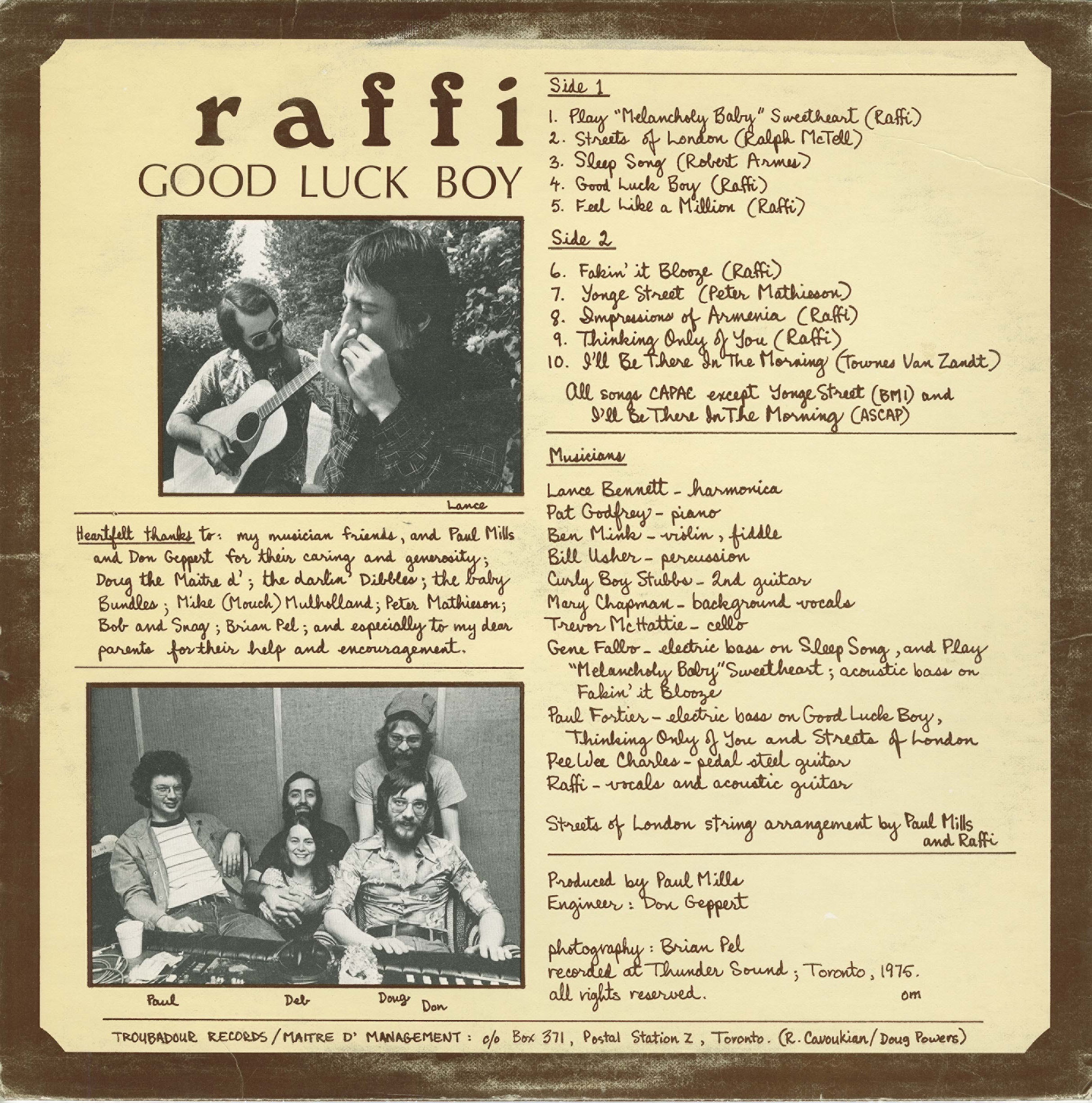 Good Luck Boy is Raffi's first LP album for his Troubadour label, released in 1975. This is one of two records Raffi made with adult listeners in mind (the second being Adult Entertainment (1977)). Six of the ten songs on this album were written by Raffi, two of the non-Raffi tracks written by folk artists Townes Van Zandt ("I'll Be Here In The Morning"), Ralph McTell ("Streets of London"), Robert Armes ("Sleep Song"), and the great ode to Toronto's most famous street by the talented Mr. Peter Mathieson ("Yonge Street"). It is currently not available in CD format.