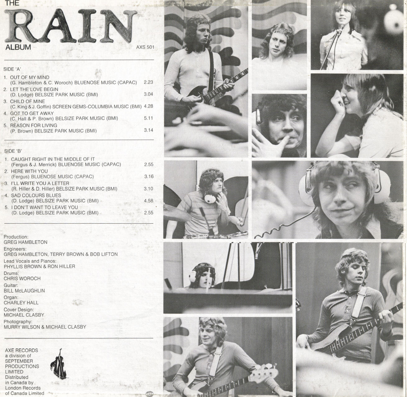 Members of RAIN are drummer Chris Woroch, guitarist Bill McLaughlin, lead vocalist Phyllis Brown, bassist Ron Hiller and keyboards Charlie Hall. Producer Greg Hambleton brought his song "Out Of My Mind" to Rain and recorded and engineered the session at Sound Canada Studios in early 1971. After its release by London Records in April, it took seven months before finally charting in November and now established as one of the biggest hits of that year. This was followed by "Stop Me From Believing" (AXE 1) - both singles released by Bell Records in the United States.