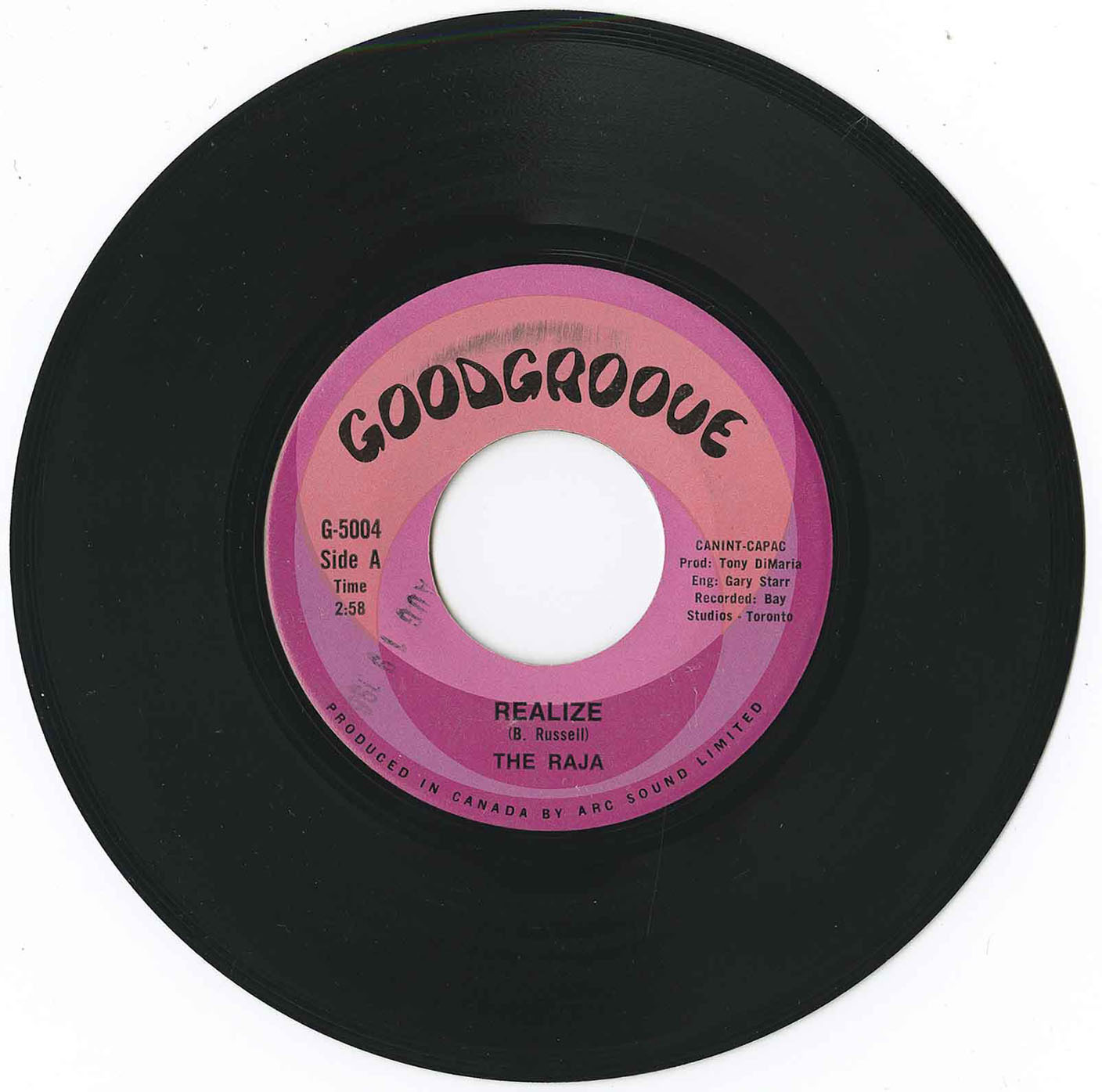 In 1968, The Raja recorded their only single, "Realize", a haunting track that blended a menacing guitar and vocal intro with a melodic popsike chorus. It was produced by Tony DiMaria at Arc Sound Limited and engineered by Gary Starr at Bay Studios in Toronto. The B-side, "Drifting in the Wind", provided a gentler contrast to the A-side’s darker mood. Though their single failed to chart, "Realize" became a cult favorite in later years, with mint-condition copies fetching high prices among collectors.