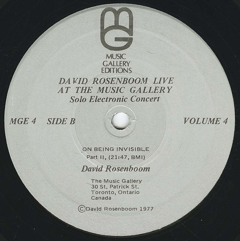 Recorded by Michael Brook live at the Music Gallery, Toronto, 12 February 1977. A solo electric concert utilizing hybrid-computer wave analysis and sound synthesis. brain signals, touch sensors, and small acoustic sources. The sound generating and computer interface hardware was custom designed by Don Buchla with additional equipment for brain signal analysis and computer interface designed by the composer.