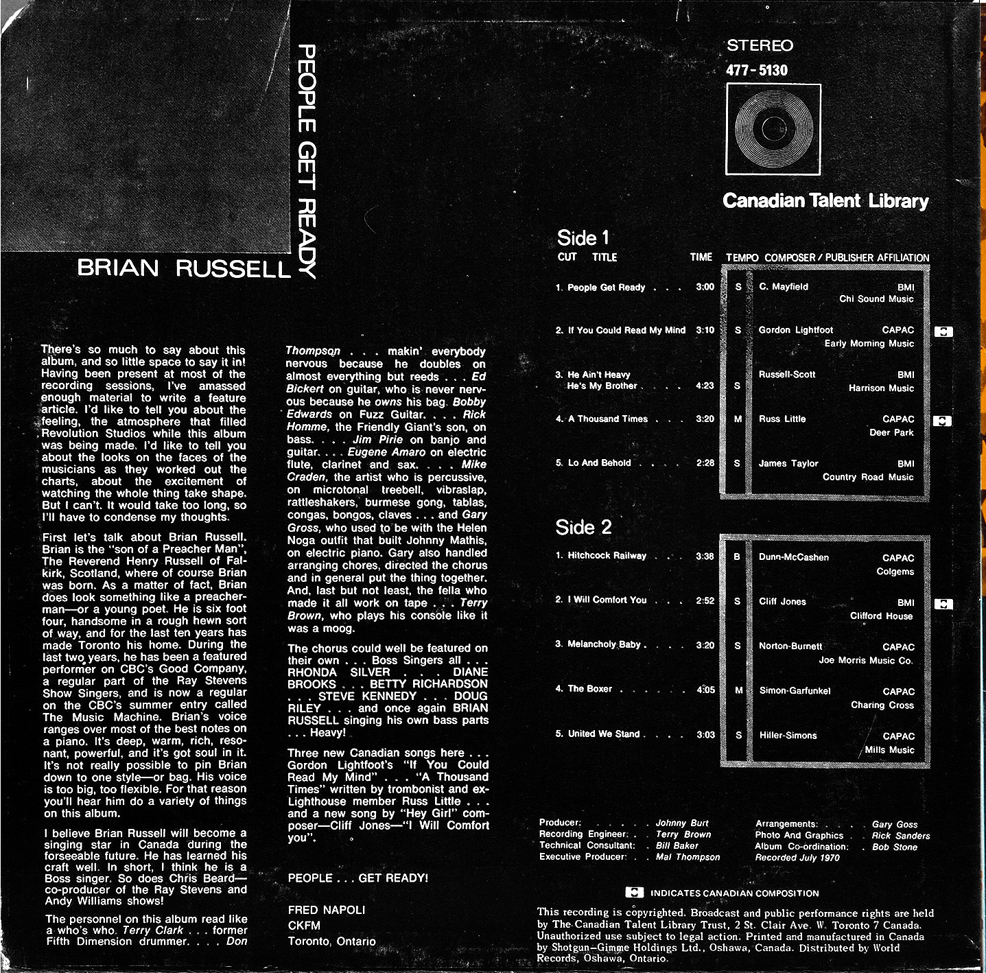 Three new Canadian songs here ... Gordon Lightfoot's "If You Could Read My Mind" ... "A Thousand Times" written by trombonist and ex-Lighthouse member Russ Little ... and a new song by "Hey Girl" composer--Cliff Jones--"I Will Comfort You".