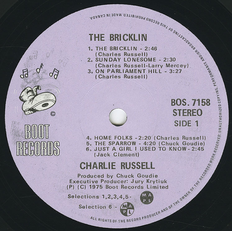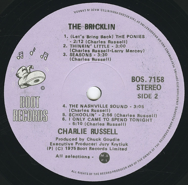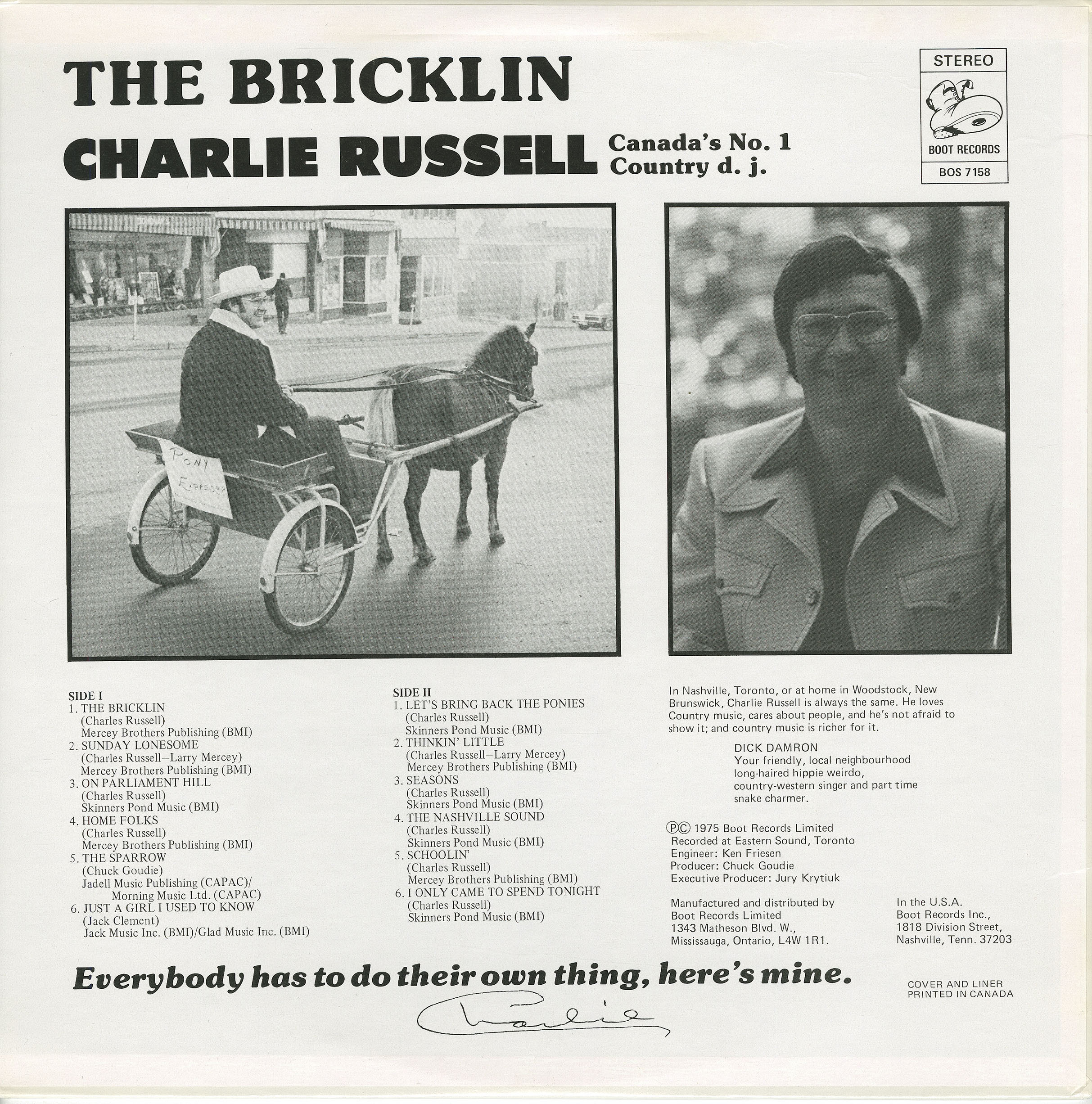 About this time he began to be recognized for his satirical song writing. In 1975, Charlie recorded “The Bricklin”, a political country satire album on Stompin' Tom’s Boot Records. The Bricklin's were Canada's contribution to automobile design. While the car failed, the song became a hit. The song "The Bricklin" went to # 17 on the National Charts and was featured on National TV and Radio news. Other hits included “On Parliament Hill”, and “Let's Bring the Ponies Back”. He has written more than 50 songs. A learned paper on “Goodtime Charlie and the Bricklin” was presented at the Canadian Historical Association in 1977. All 3,000 Bricklins were assembled in Saint John, New Brunswick.