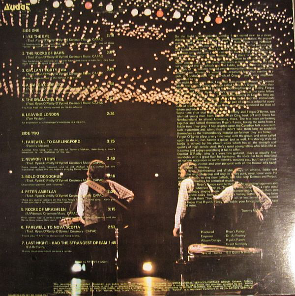 Some time after that night, Dermot O'Reilly and Fergus O'Byrne, two talented young men from Dublin's fair city, took off with Denis to Newfoundland to attend University there. The Trio kept performing togeather and named themselves Ryan's Fancy, taking the name from a fiddle tune they play. They erupted upon the Canadian folk scene with such dynamism and talent that it didn't take them long to establish themselves as the tremendously popular performers that they are today.