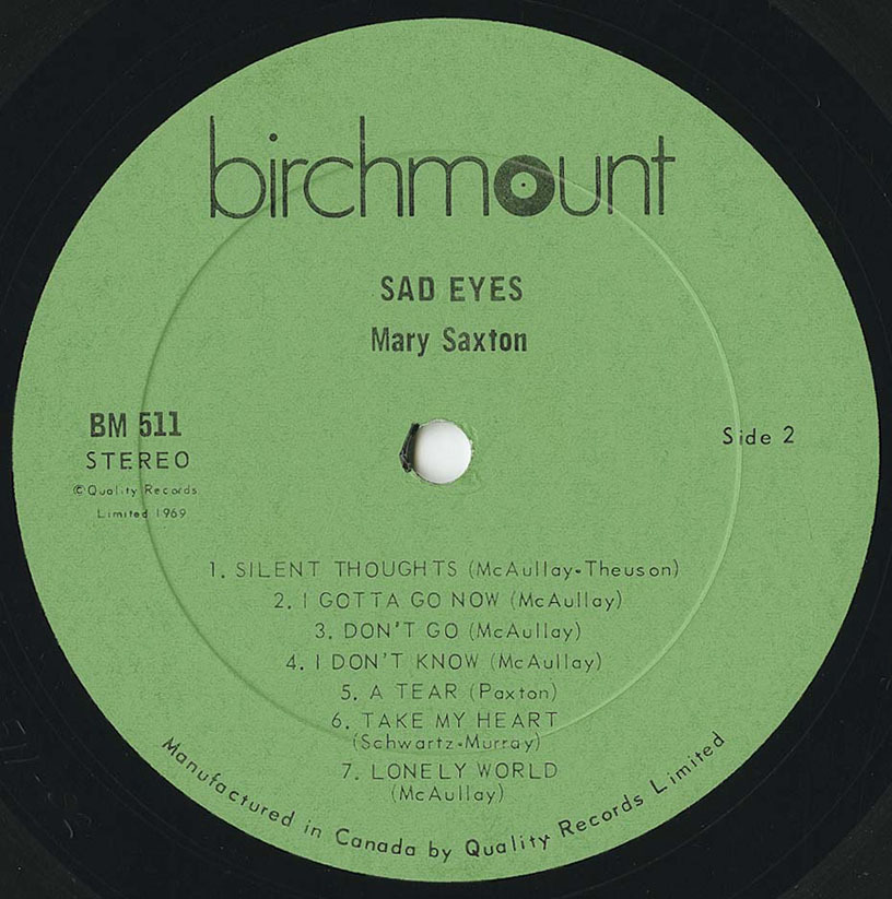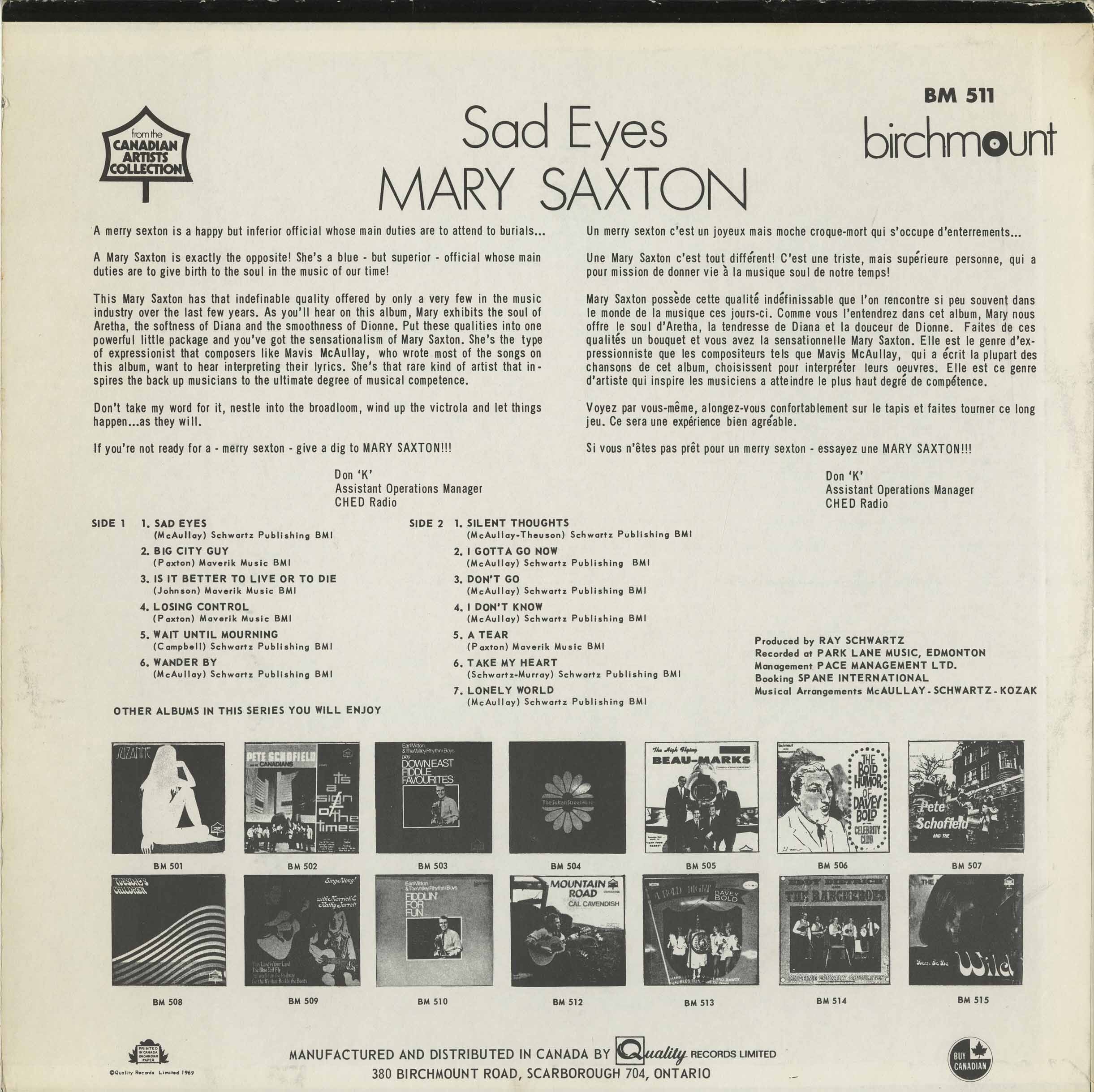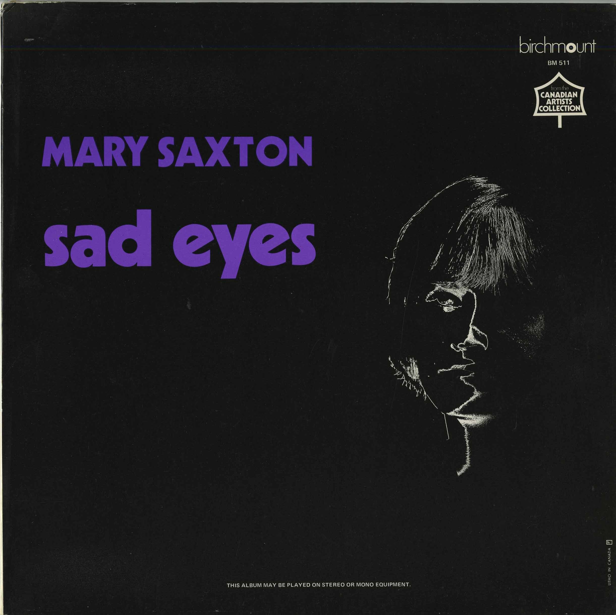 “One of the things about joy is that once you're lucky enough to feel it, you don't always succeed in expressing it for yourself or for others. But there's one girl — a dark-eyed entertainer of charm and warmth who does and can help you to do it too. Mary Saxton can make you feel good, simply because she is so obviously 'feelin' fine' and her songs will definitely please you. Mary has been singing professionally for many years in Western Canada, both on radio and television and has been active in album work as a back-up vocalist. Her talents as a songwriter come to light for the first time on this recording and with help from arranger Curt Watts, Mary shows you that music is her life. Please share it with her.”