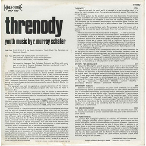 The Lawrence Park Collegiate Orchestra of Toronto and members of the North Toronto Collegiate Orchestra appear together in Threnody. Both schools are well known for their music departments, and the music programme is administered by the Toronto Board of Education through John P. Barron. In addition to his regular duties, Mr. Barron also conducts the Lawrence Park Singers, a mixed choir of adults and students which has appeared frequently in concert and at the Stratford and Guelph Festivals. He has been associated with the CBC, the Kiwanis Music Festival and the Ontario Parks Music department, as well as conducting choirs in Canada, the U.S.A. and Europe. The student soloists on this recording are Heather Pringle, Heather Moore, Barbara Hoshko, Elizabeth Lister, Christina Procunier, Mary Tarr and Eric Mah.