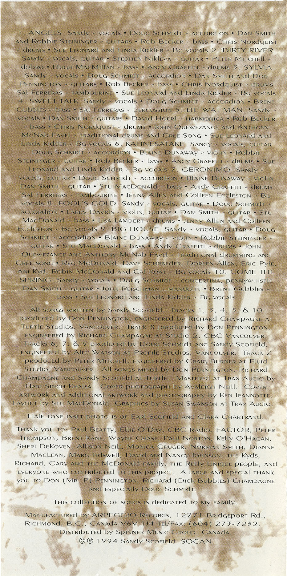 BIG HOUSE Sandy – vocals, guitar • Doug Schmidt – accordion • Blaine Dunaway – violin • Robbie Steininger – guitar • Stu MacDonald – bass • Andy Graffiti – drums • John Quewezance and Anthony McNab Favel – traditional drumming and Cree song • Reg McDonald, Dave Schraeder, Doreen Allen, Eric Pyle, Ani Kyd, Robin McDonald and Cai Koat – Bg vocals