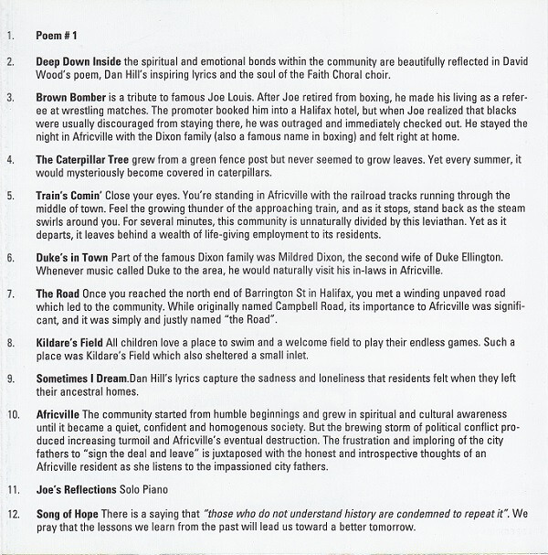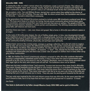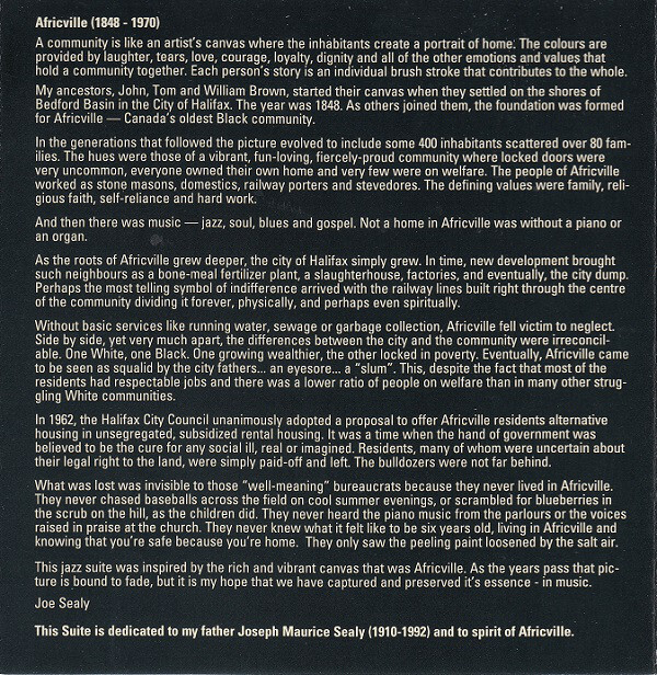 Joe Sealy's Africville Suite was premiered at the 10th annual Du Maurier Downtown Toronto Jazz Festival on June 22nd. The musicians: Joe (piano), Paul Novotny (bass), Daniel Barnes (drums), Rob Piltch (guitar), Michael Stuart (tenor and alto saxophones), and Faith Chorale, a 30-member choir of singers from England, Jamaica, South America and Canada under the direction of Sharon Riley. Featured vocalists were Sharon Lee Williams and Dutch Robinson.