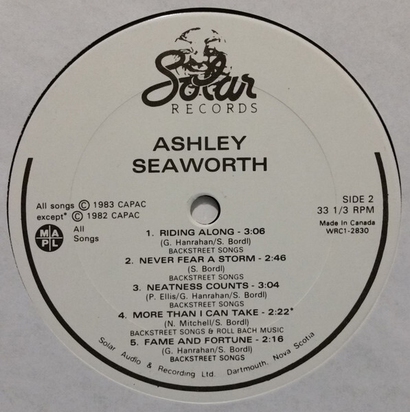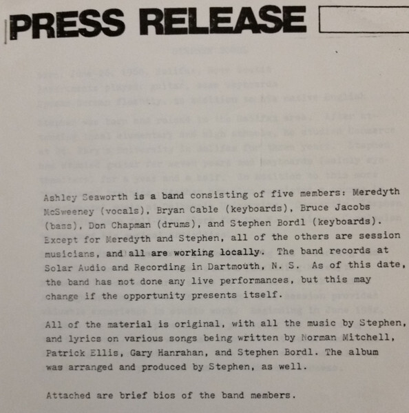 Ashley Seaworth is a band consisting of five members: Meredyth McSweeney (vocals), Bryan Cable (keyboards), Bruce Jacobs (bass), Don Chapman (drums), and Stephen Bordl (keyboards). Except for Meredyth and Stephen, all of the others are session musicians, and all are working locally. The band records at Solar Audio and Recording in Dartmouth, N. S.. As of this date, the band has not done any live performances, but this may change if the opportunity presents itself.