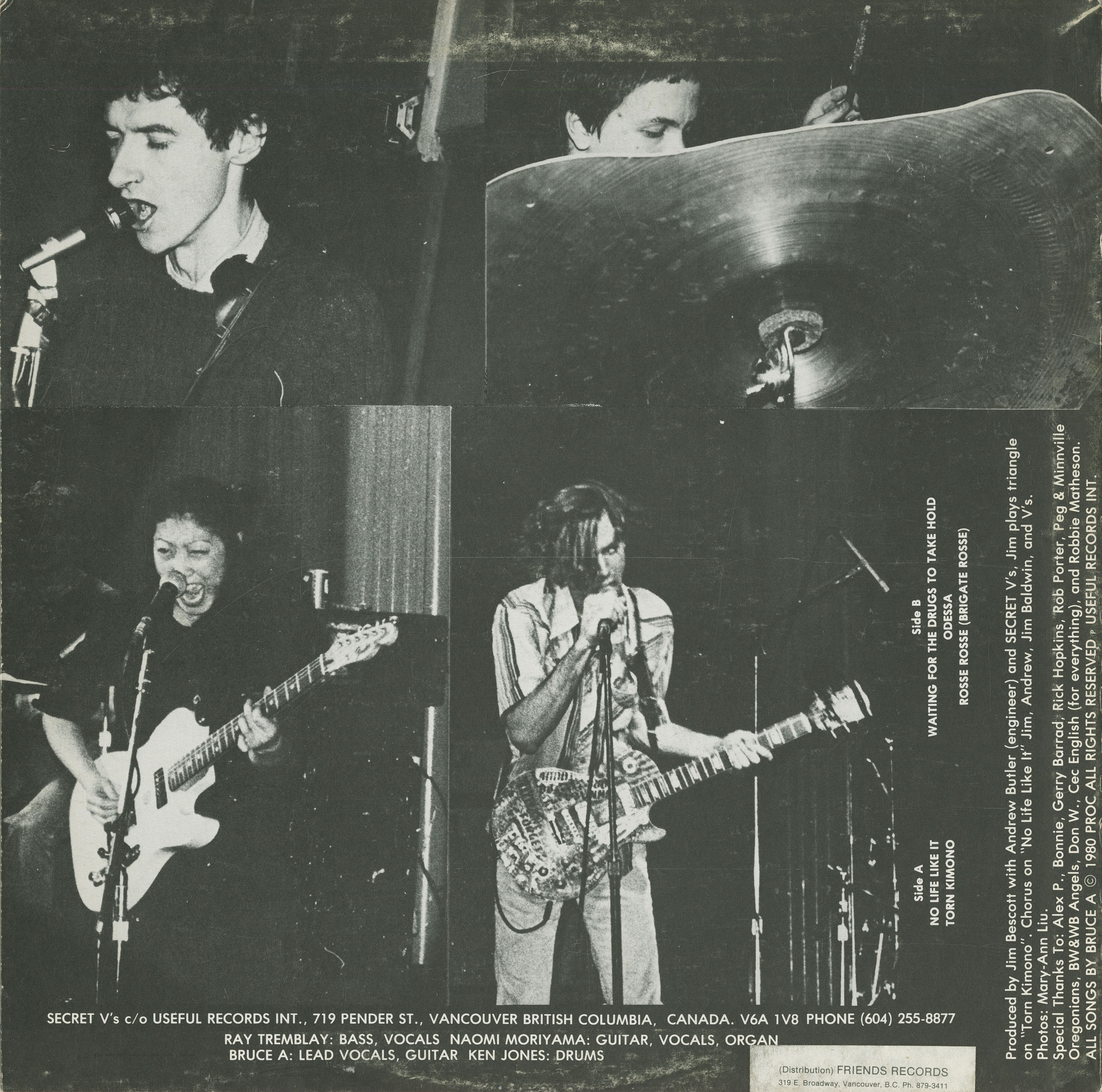 Following the departure of Fuller in 1981, the band recruited Naomi Moriyama, whose versatile skills on guitar, organ, and vocals helped push the Secret V’s into darker, more brooding territory. The lineup of Archibald, Moriyama, Tremblay, and Jones cut the band's second EP, No Life Like It, released by Useful Records International later that same year. The standout track, “Waiting for the Drugs to Take Hold,” became a cult classic—its bleak melody and confessional lyrics capturing the disaffected, comedown side of the punk experience. Years later, it was named one of the 50 greatest songs to emerge from Vancouver by The Georgia Straight and was included on the seminal double-CD compilation Last Call: Vancouver Independent Music 1977–1988 (Zulu Records, 1991).