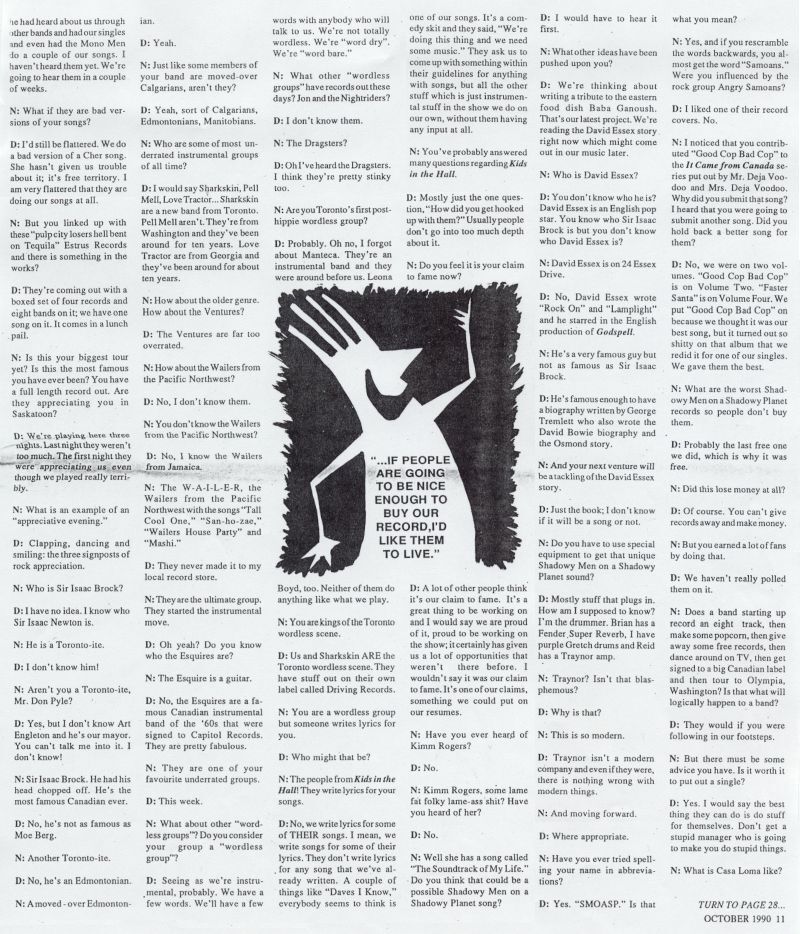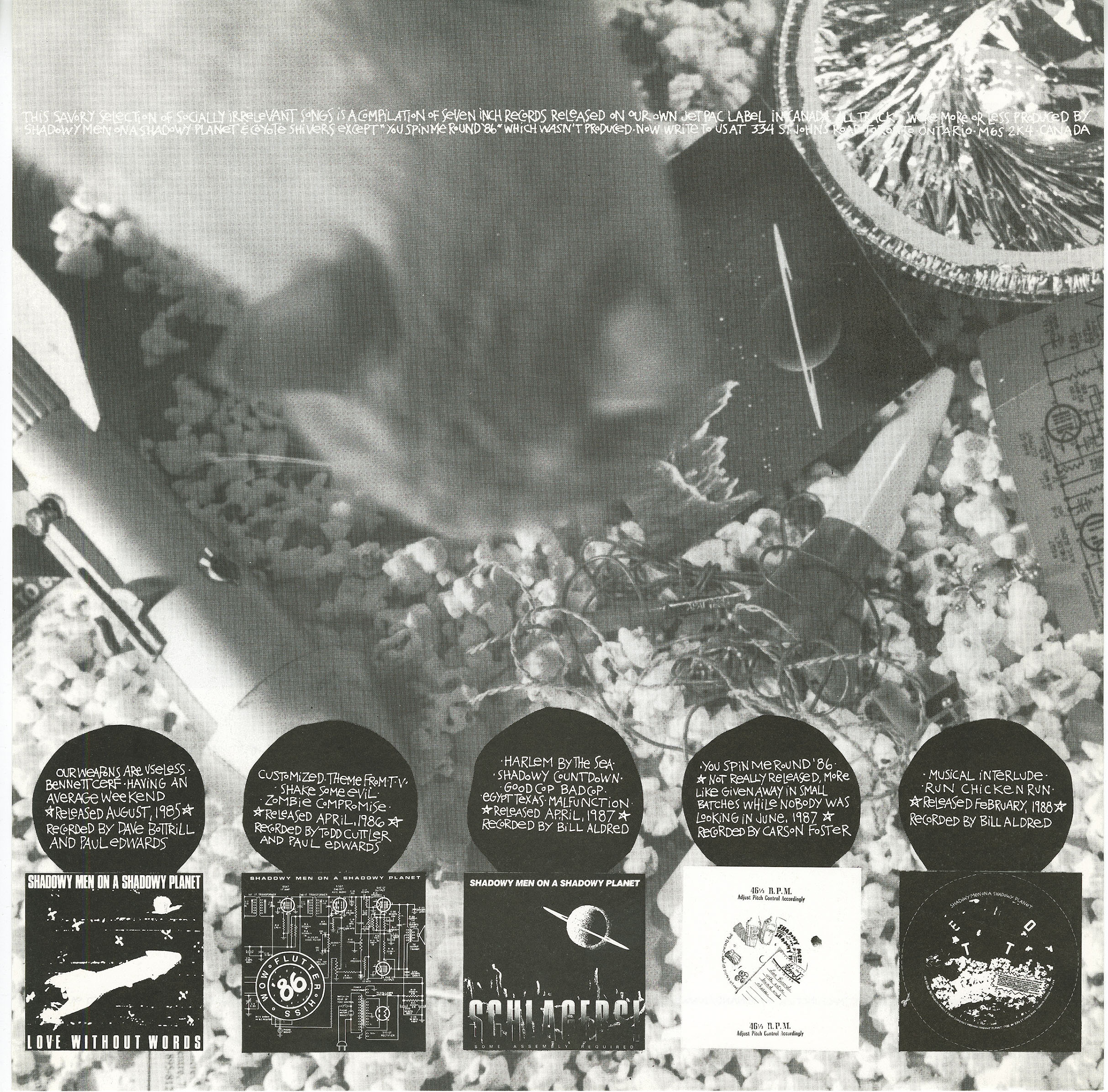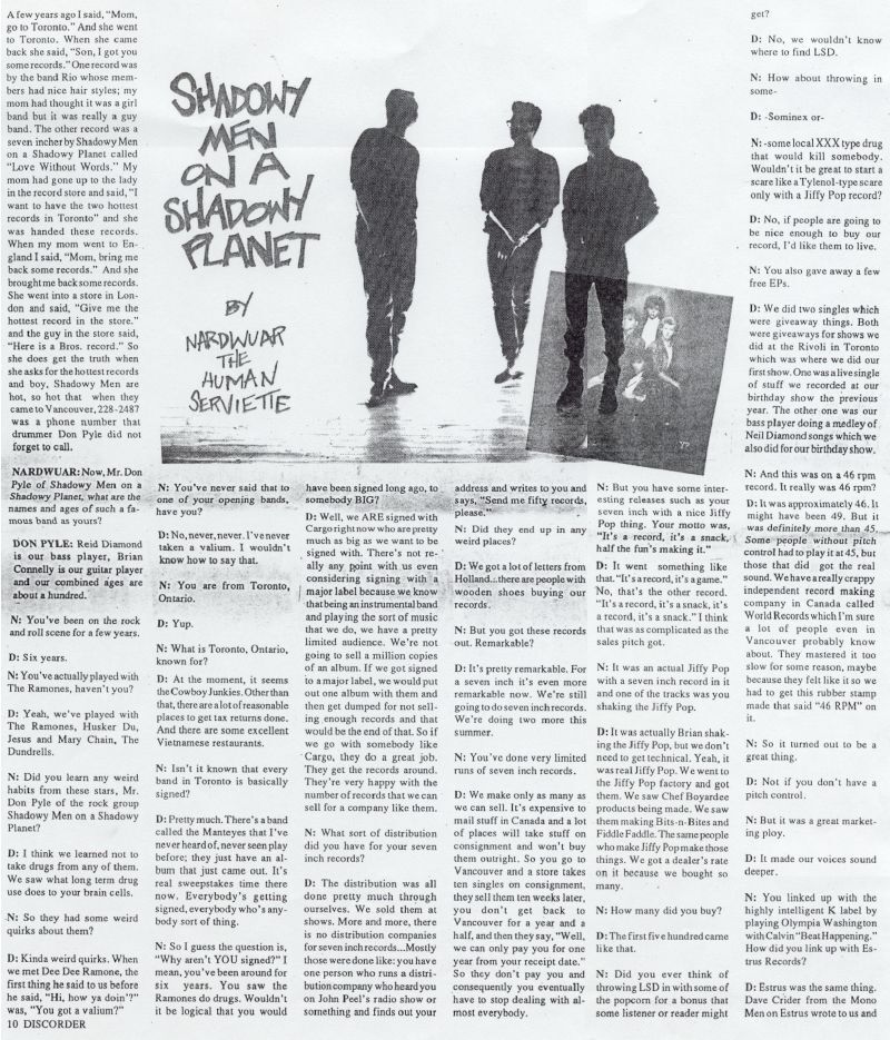 A few years ago I said, "Mom, go to Toronto." And she went to Toronto. When she came back she said, "Son, I got you some records." One record was by the band Rio whose members had nice hair styles; my mom though it was a girl band but but it was really a guy band. The other record was a seven incher by Shadowy Men On A Shadowy Planet called "Love Without Words." My mom had gone up to the lady in the record store and said, "I want to have the two hottest records in Toronto" and she was handed these records. When my mom went to England I said, "Mom, bring me back some records." And she brought me back some records. She went into a store in London and said, "Give me the hottest record in the store" and the guy in the store said, "Here is a Bros. record." So she does get the truth when she asks for the hottest records and boy, Shadowy Men are hot, so hot that when they came to Vancouver, 228-2847 was a phone number that drummer Don Pyle did not forget to call.