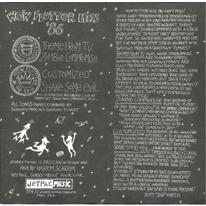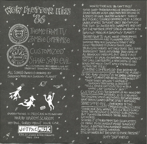 There's at least four slightly different covers for Wow Flutter Hiss, one black and white, and two different versions with the logo shaded. In addition, the single came with an iron-on transfer. Scans are on the Wow Flutter Hiss '86 cover page. "Customized" is credited on the sleeve as being recorded live, but it sounds like a studio recording to me. "We Are The Weird" is the apparent title of the last song, recorded backwards. You can hear the band playing what sounds like a rehearsal, along with someone on sax. Maybe an outtake from the session for the demo tape when Tad Winklarz played on "Customized"?