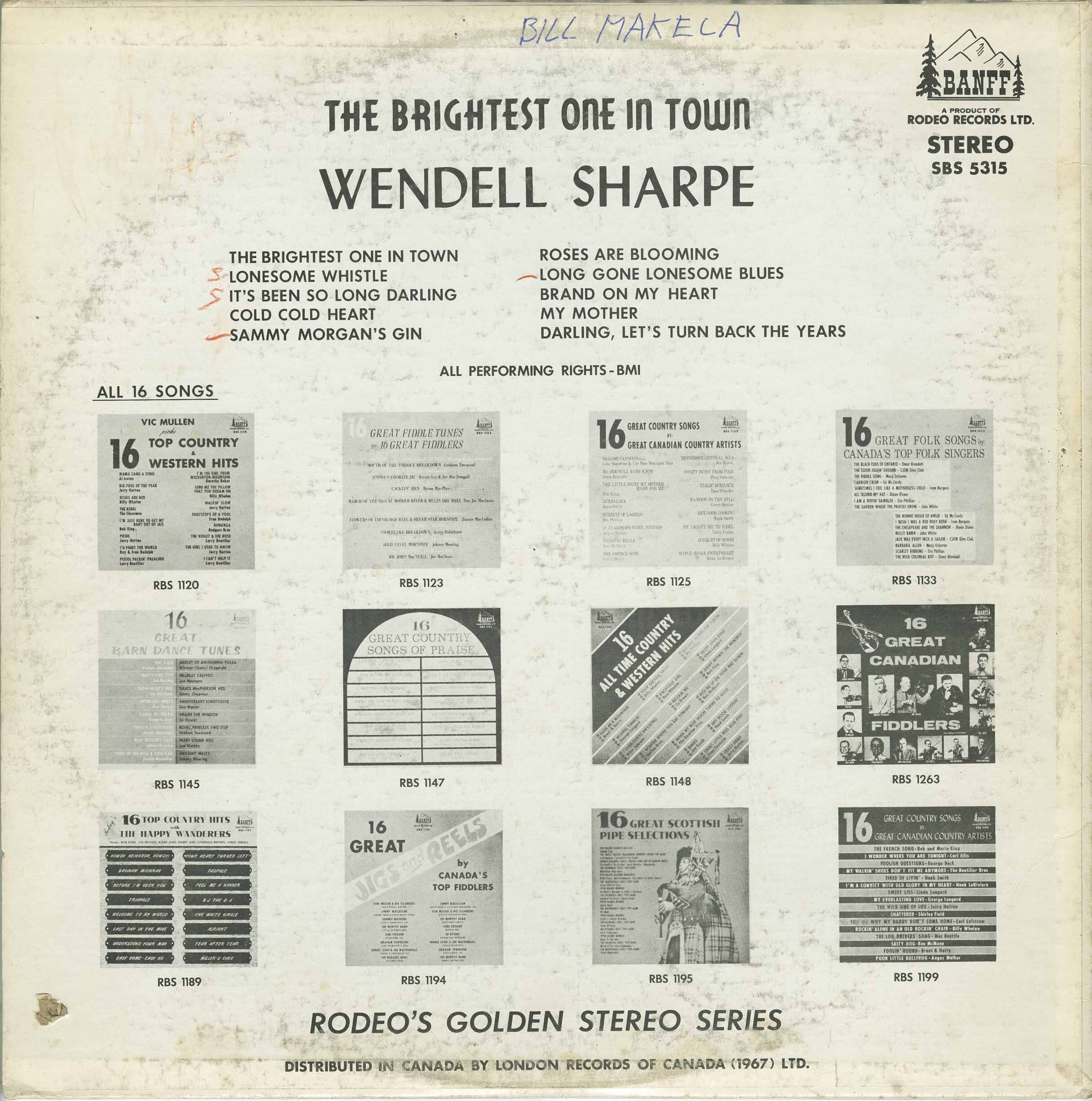 Wendell had a passion for country and western music which he played on his guitar, and sang. He also wrote the lyrics and melodies to several songs. In his younger years he had a weekly live request program on CKNB, the local radio station several of which were broadcast across the Atlantic provinces on various other radio stations. Wendell cut his first LP and 45, "The Brightest One in Town" in 1967. Later he produced a cassette called "Wendell Sharpe and Friends" and most recently several CD's at the request of those who loved his music. He also sang and played on radio station CFIC Restigouche within the last couple of years.