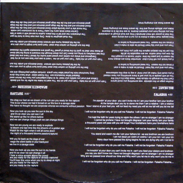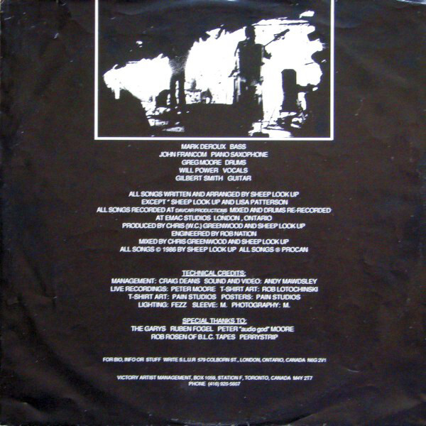 In 1986 the vinyl EP Sheep Look Up was released. The record consisted of four songs: "Rapture", "Falasha", "Big Heart" and "Spaghetti Western", and got a good deal of local airplay. The Milan, Italy and Bath, England. The band toured "Across the left half of Canada" in the spring and fall of 87 to promote the EP.