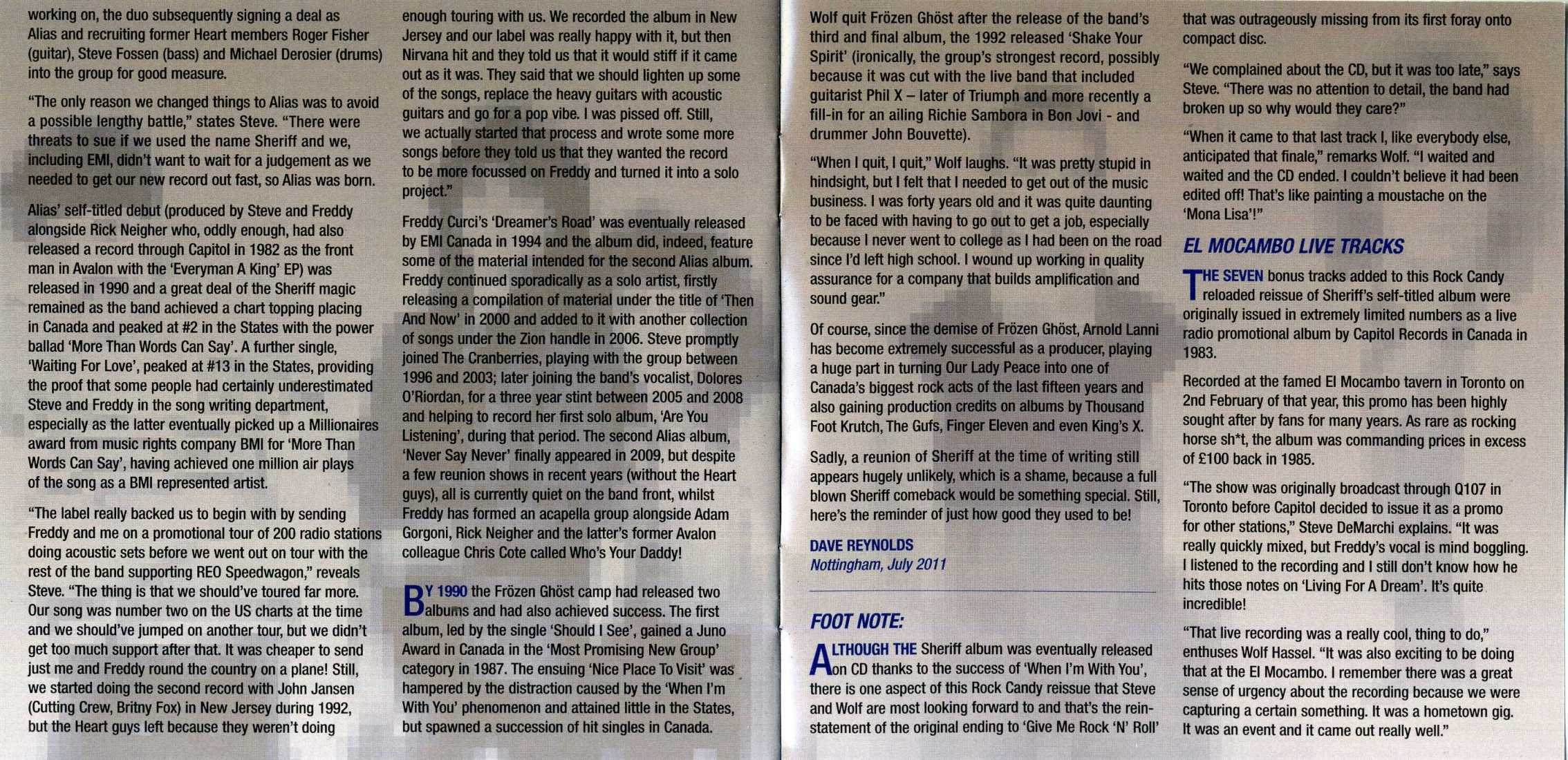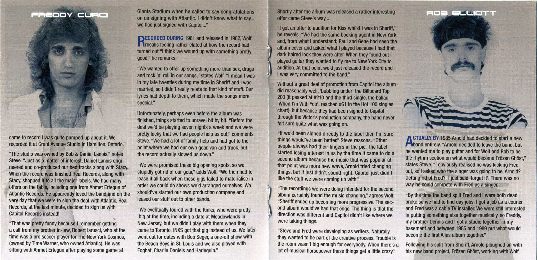 Sheriff finally signed with Capitol Records in 1983, four years after forming in Toronto. Though the band released only one album, a self-titled LP in 1983, their single "When I'm with You" reached number one six years after it was released. Vocalist Freddy Curci, guitarist Steve De Marchi, bassist Wolf Hassel, drummer Rob Elliott and keyboard player Arnold Lanni were pressured to re-form, but they declined since Lanni and Hassel had formed Frozen Ghost while Curci and De Marchi organized Alias.