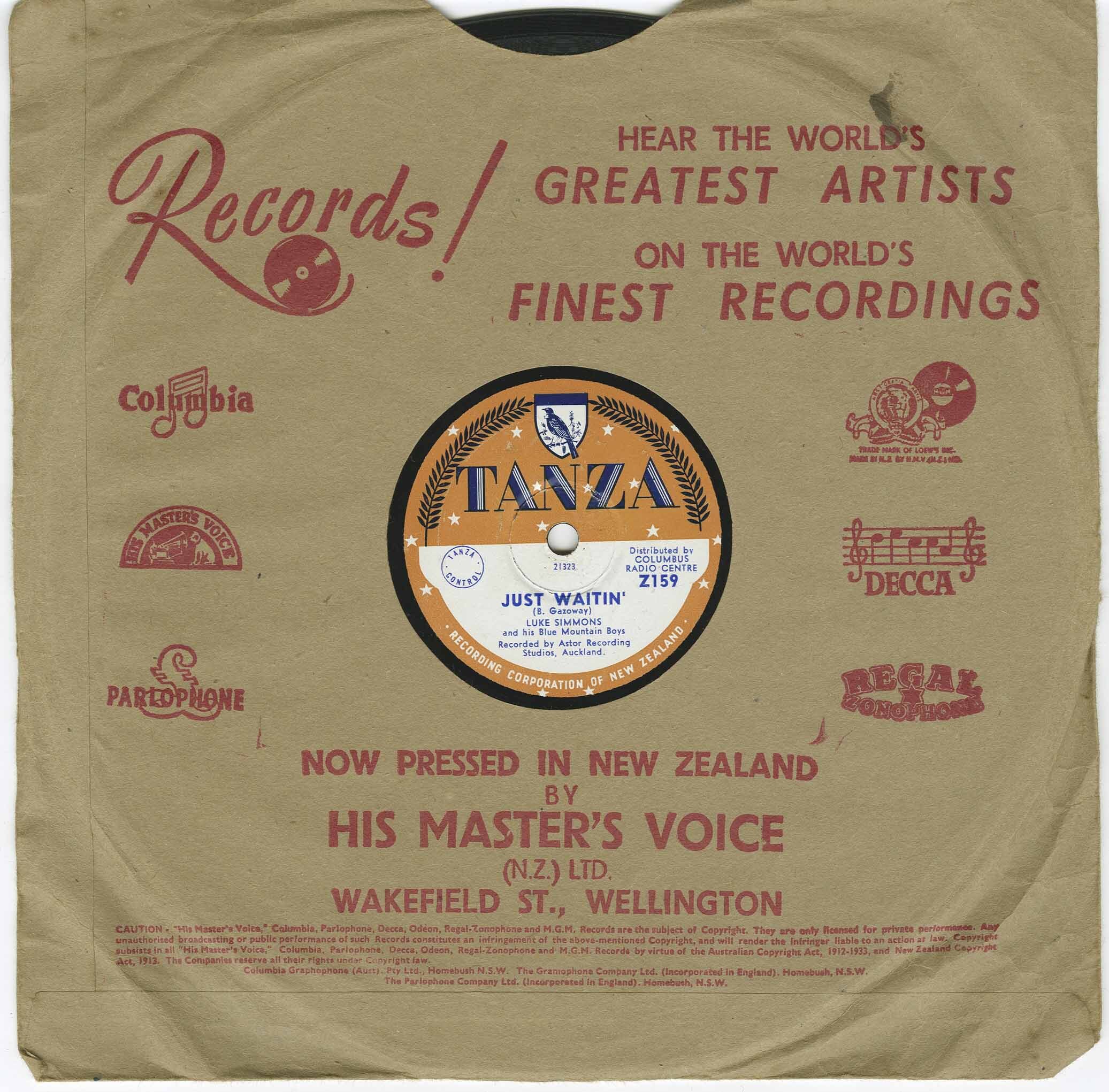 Luke Simmons and His Blue Mountain Boys moved from their native Vancouver, British Columbia to New Zealand in the early 1950's and recorded dozens of 78's on the Tanza label at the Astor Recording Studios in Auckland, New Zealand. The group consisted of the three Canadians Luke Simmons on vocals, Vic Crane on bass, and Clarence LeVesque on fiddle. "Howlin at the Moon" was one of his first recordings.