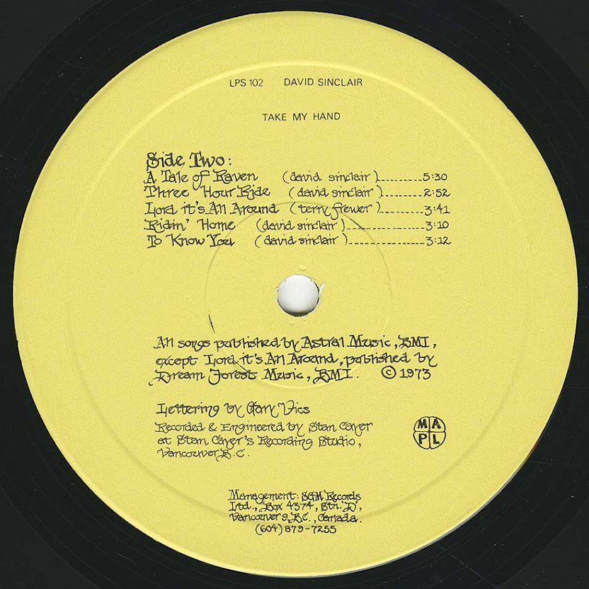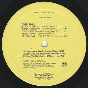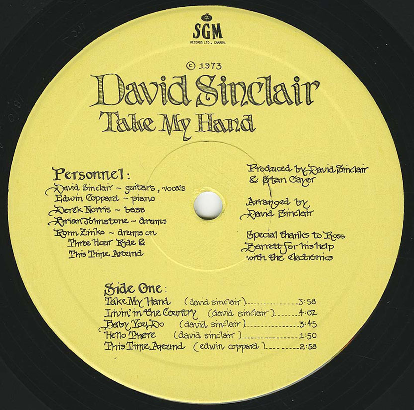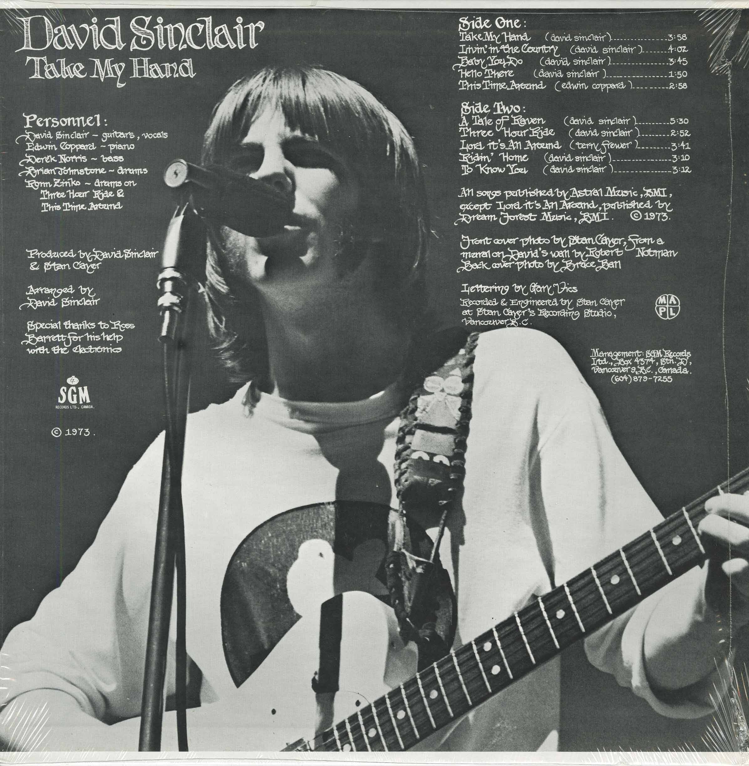 Re-issued in 2011 on Regenerator Records, fully remastered from the original tapes including 7 previously unreleased bonus tracks. Big thanks to the folks at Regeneration Records for making this rare and collectible album available again. To order David Sinclair Take My Hand visit here: