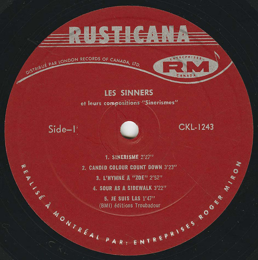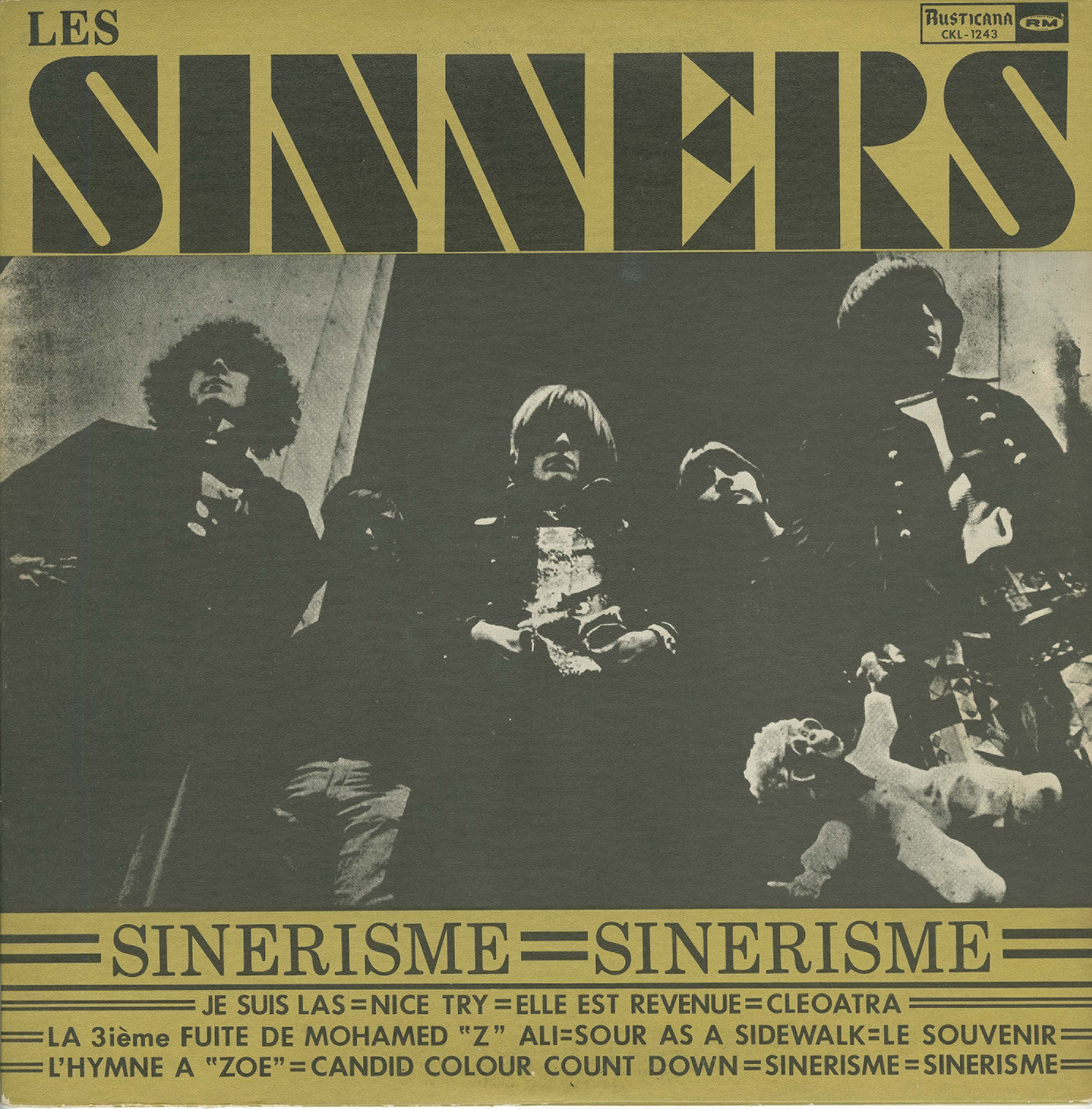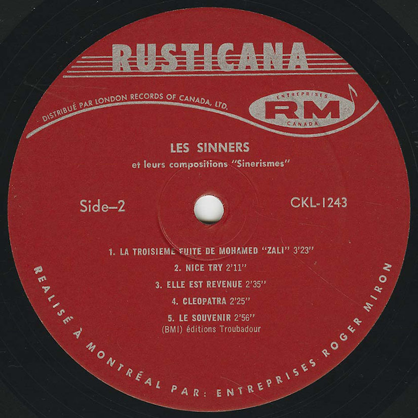 Under Miron’s guidance, Les Sinners recorded three French-language singles—including “Sinnerisme”—before cutting their debut LP Sinerisme. The album, whose title playfully drops one “n,” appeared in 1967 and is now among the rarest and most sought-after Canadian garage records. Its songs toggle between snarling English-language rockers such as “Nice Try”—later anthologized on Pebbles Vol. 13—and more melodic French pieces like the title track, later reissued on The Essential Pebbles Collection Vol. 1. It’s a bilingual record full of quirky invention: “Candid Colour Count Down,” “Sour as a Sidewalk,” and “La troisième fuite de Mohamed ‘Z’ Ali,” a surreal nod to Muhammad Ali’s 1964 conversion and renaming. The album’s balance of grit and playfulness captured the very spirit of Montréal’s new rock identity.