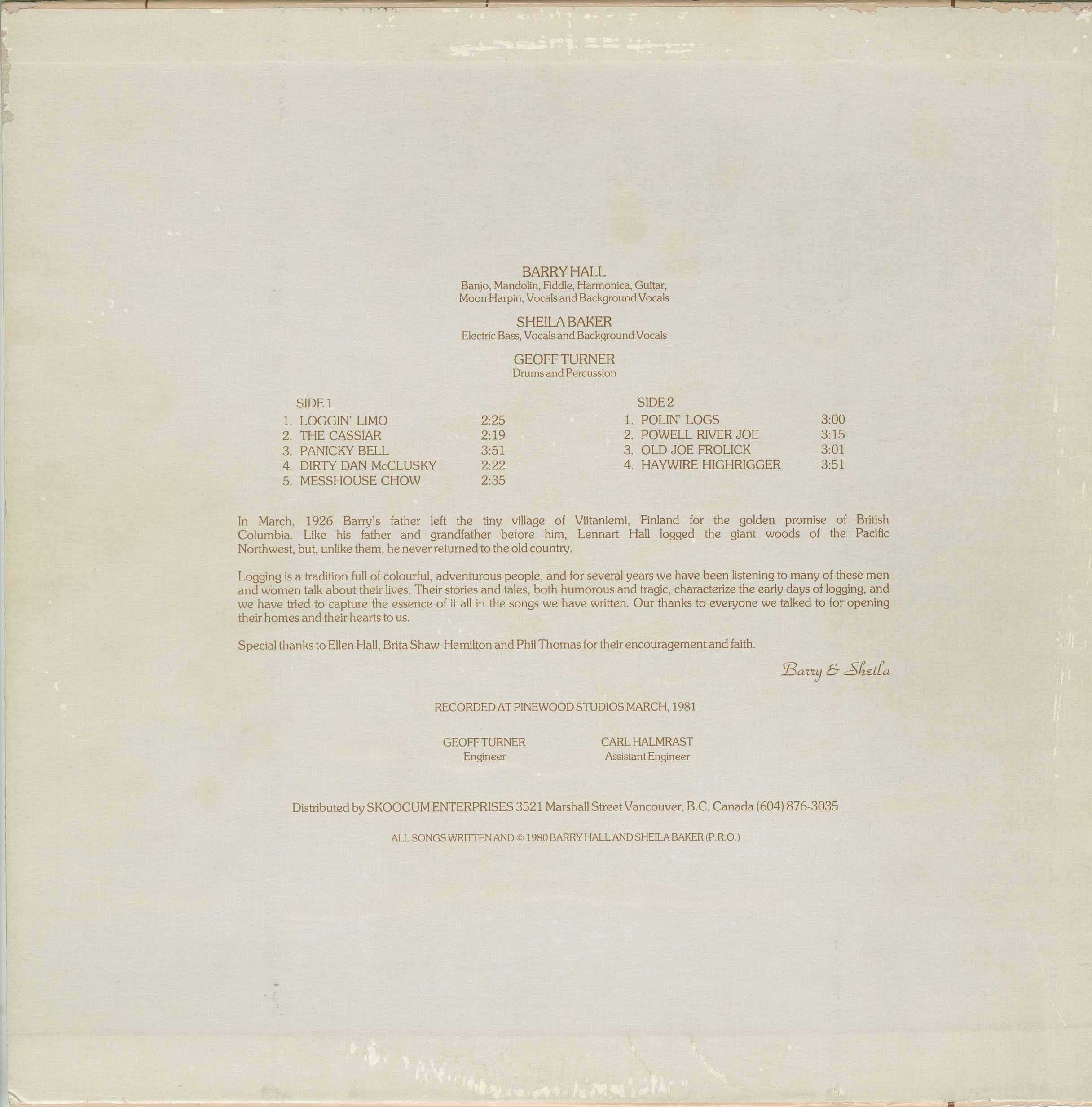 Logging is a tradition full of colourful, adventurous people, and for several years Barry Hall and Sheila Baker listened to many of these men and women talk about their lives. Their stories and tales—both humorous and tragic—characterize the early days of logging, and the songs on this album were written in an effort to capture that experience. Thanks are extended to everyone who opened their homes and their hearts.