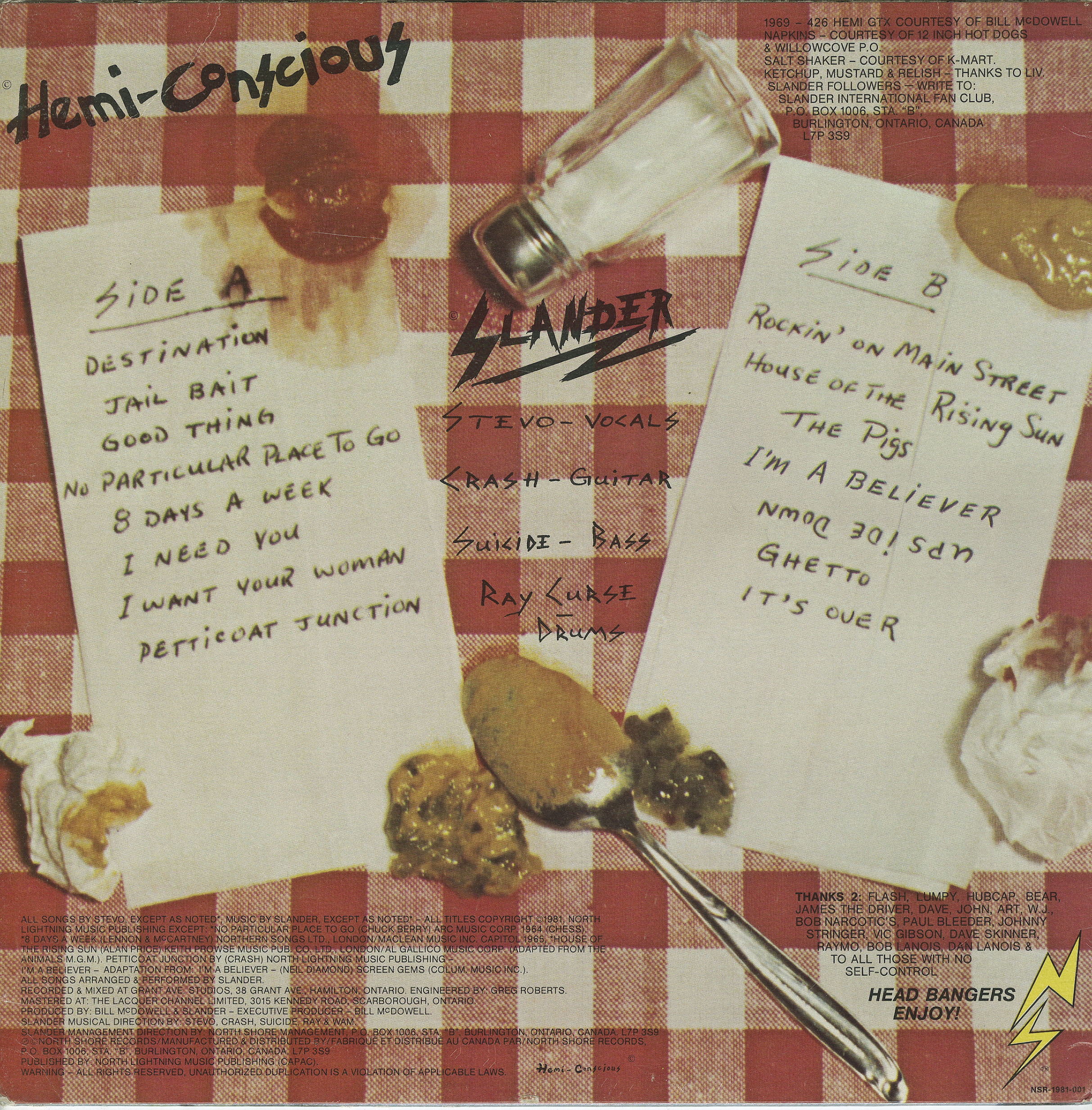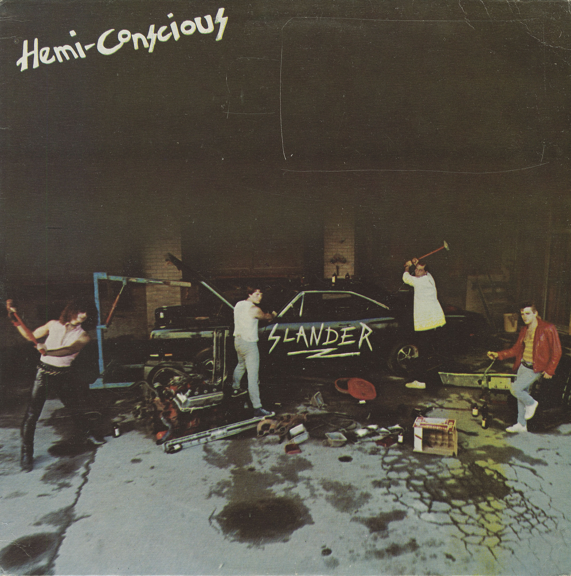 The band started out with me being a punk who drank with Slander but was soon to become the guitar player. The band consisted of Stevo (vox) whom I used to play with in another band from Burlington, Ray (drums) who later went on to find fame with Junkhouse, Chriss Suicide (bass) former Forgotten Rebel, John F. (lead guitar) who was a nobody in the punk scene and Paul Bleeder (rhythm guitar) whom I replaced. After doing a few gigs at the Turning Point in Toronto, John thought I was too unprofessional because I broke too many guitar strings and was too ... energetic ! So he quit the band. With just the four of us remaining we moved as forward as we could and Stevo's brother got us into Grant Avenue Studio through Bill McDowell who became our "manager". See Stevo's brother was doing some contract work for Bill and Bill was wanting to become involved with us as a promoter. He already managed "The Machines"! and "Cleveland" who were nothing like us but he tried make us "commercially acceptable" by releasing our "Hemi-conscious" LP which was done at Grant Avenue Studio. I think he had 5000 copies printed and we saw $0.00 from that. We didn't care ...then ! So after a brief and often absense with Chriss Suicide this young punk who hung out with us became the bass player and we did a few more shows. This bass player was Dave McGhie who later went on to be the drummer for the Forgotten Rebels for many years. Funny we never get mention when it comes to Hamilton punk history, only Teenage Head and The Forgotten Rebels get press but we were punks in every sense of the word. Drinkin' , fightin ', fuck authority and F.T.W. were our attitudes. I went on years later to be the front-man for Columbian Necktie and then went on to be in The HammerbOiz. After that went south Barney (Hammerboiz, Bassbag, Problem Children) and I started The Chico Maki Punk Rock Experience. It! went south also. We just couldn't get together anymore ... lives and jobs.