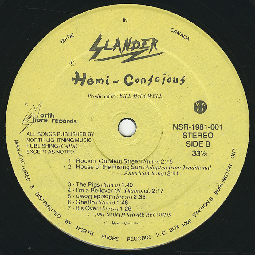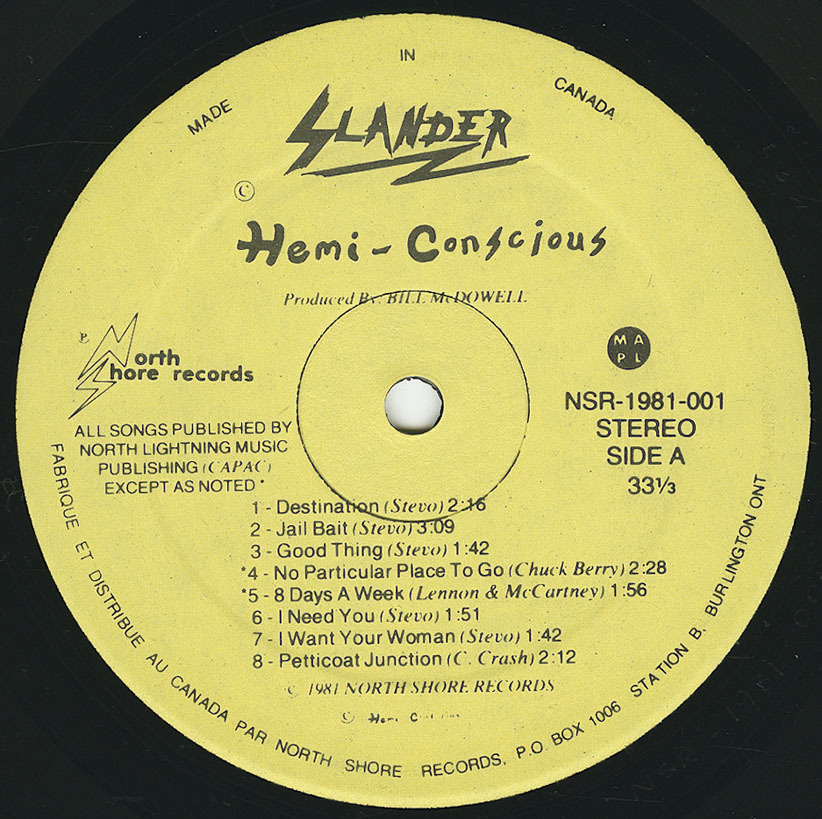 Slander represent part of Hamiltonās unwritten past. And it is kind of crazy because they were one of a few bands to get a full length out back in 1981. That is a feat unto itself. But they had a lot of other things stacked against them. They werenāt entirely well liked among their peers. There was an animosity that existed between some members and TEENAGE HEAD. And yet somehow they incorporate part of the TEENAGE HEAD sound, which makes me think that there is something in that Hamilton harbour water. Songs like āNo Place to Goā exhibit the bands shared love for 50ās rock ān roll, which was a big signature on TEENAGE HEADās sound. And this is not the only bandās cover. They do a Neil Diamond song that was originally written for the Monkees in āIām a Believerā. They cover āHouse of the Rising Sunā by the ANIMALS. They even did a cover of the BEATLES ā8 Days a Weekā which in an era where the VILETONES chanted āNo More Beatles, No More Stones, We want the Viletonesā was a pretty ballsy thing to do. Either that or stupid. The band also displays a FORGOTTEN REBELS sound which makes sense given that the key guitar player was originally in the REBELS. But there is also lots of Johnny Rotten inflections in the lyrics like āI want youāre woman to be freeā. There was 5,000 of these pressed and the members never saw a dime. This is the age old story within the music industry. Itās just that this guy Bill McDowell wasnāt industry. He may have had money but he didnāt have the record industry apparatus around him. That didnāt stop him from being a dick to this band. Seems like management was a curse in this instance and so many others. But there was a record that did come out. And there are some great originals like āJail-Baitā or the ode to Hamilton in āRockinā on Main Streetā.