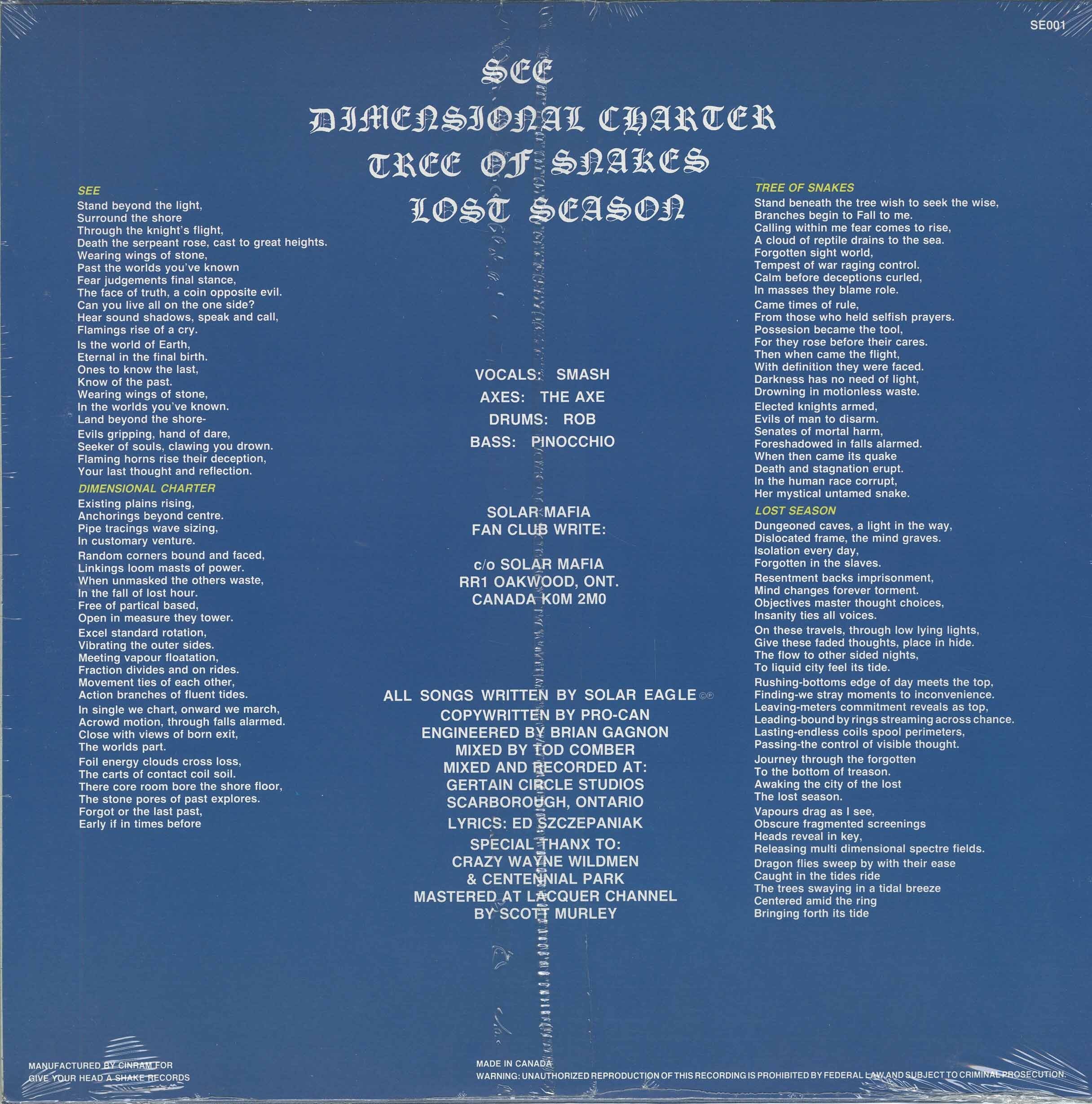 Holy grail of Canadian metal. The band was formed in Scarborough, Ontario in 1987 and featured Smash on vocals; The Axe on guitars; Pinocchio on bass; Rob on drums. The album was released in 1988, and pressed in a quantity of 1,000 copies (less than half distributed) privately on Solar Eagle SE-001 by Cinram for Give Your Head a Shake Records.