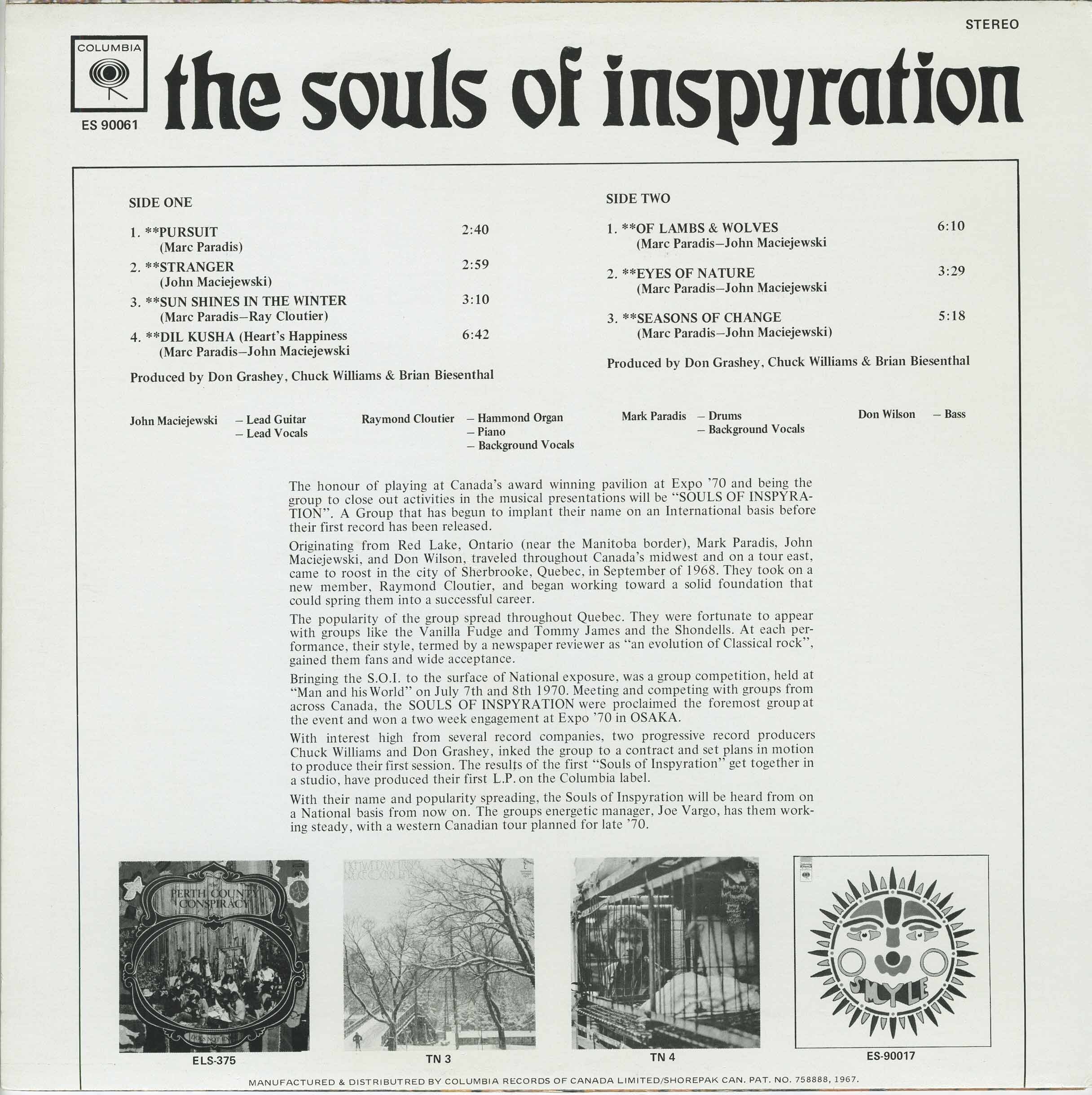 The Souls of Inspyration were a force unlike any other to emerge from the Canadian psychedelic underground. Formed in the late 1960s in the remote gold rush town of Red Lake, Ontario, the band began as a youthful collaboration between drummer-lyricist Marc Paradis, guitarist John Maciejewski, and bassist Don Wilson—friends who traded hockey sticks for guitars and quickly discovered they had something rare. Raw talent. Real chemistry. And a drive that took them far beyond their northern roots.