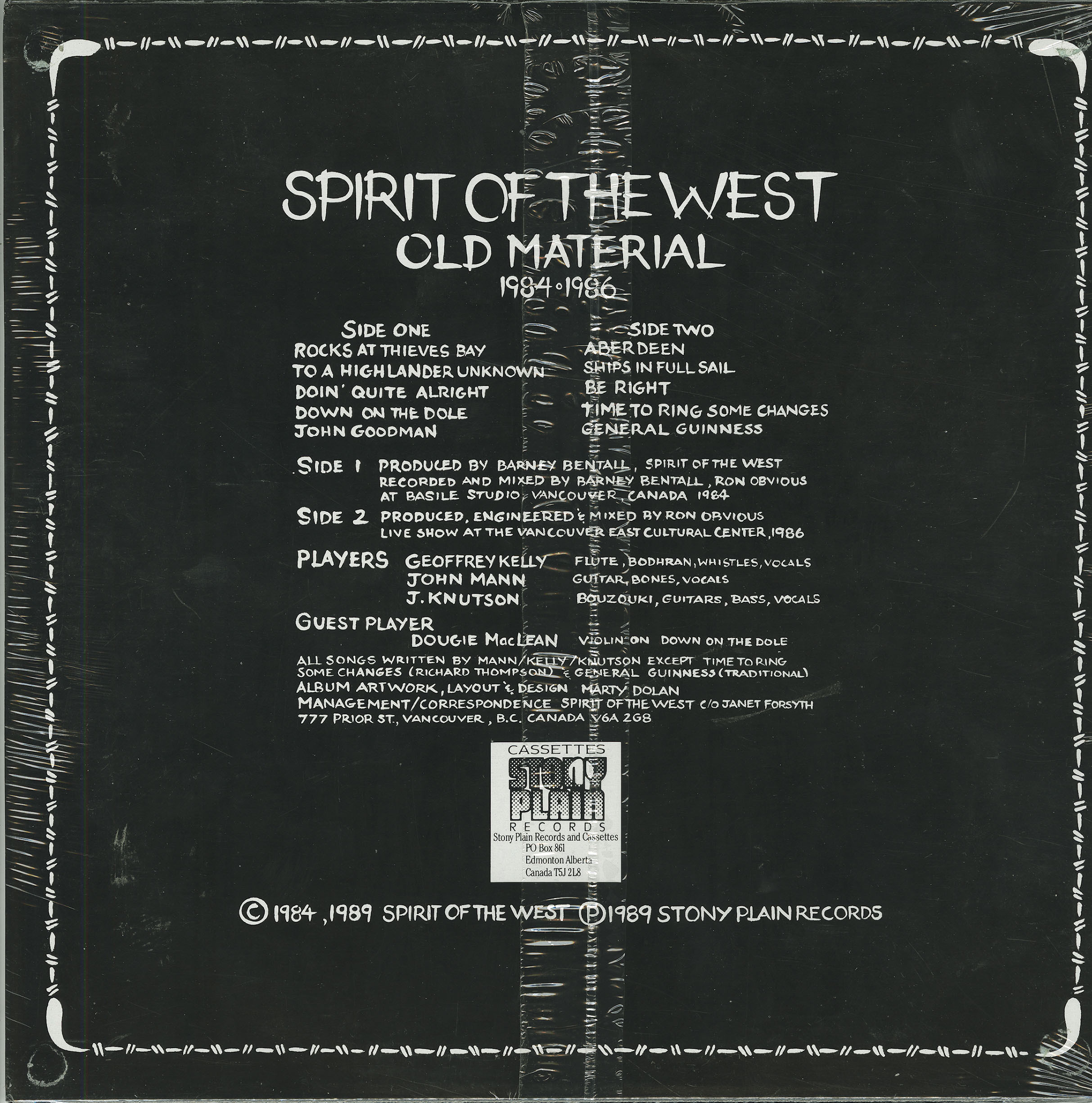 This album comprises songs culled from the band's first independent release, "Spirit of the West" (1984), for half the record, and material pulled from a live concert at the Vancouver Cultural Centre (1986) for the other half. The studio album material was produced by Barney Bentall in his old studio in a plywood mill, featuring special guest Dougie McLean (Scotland) on one track, and the live material was mixed by the careful and exacting Ron Obvious. The original studio album is no longer available, and is considered by some to be a collector's item.